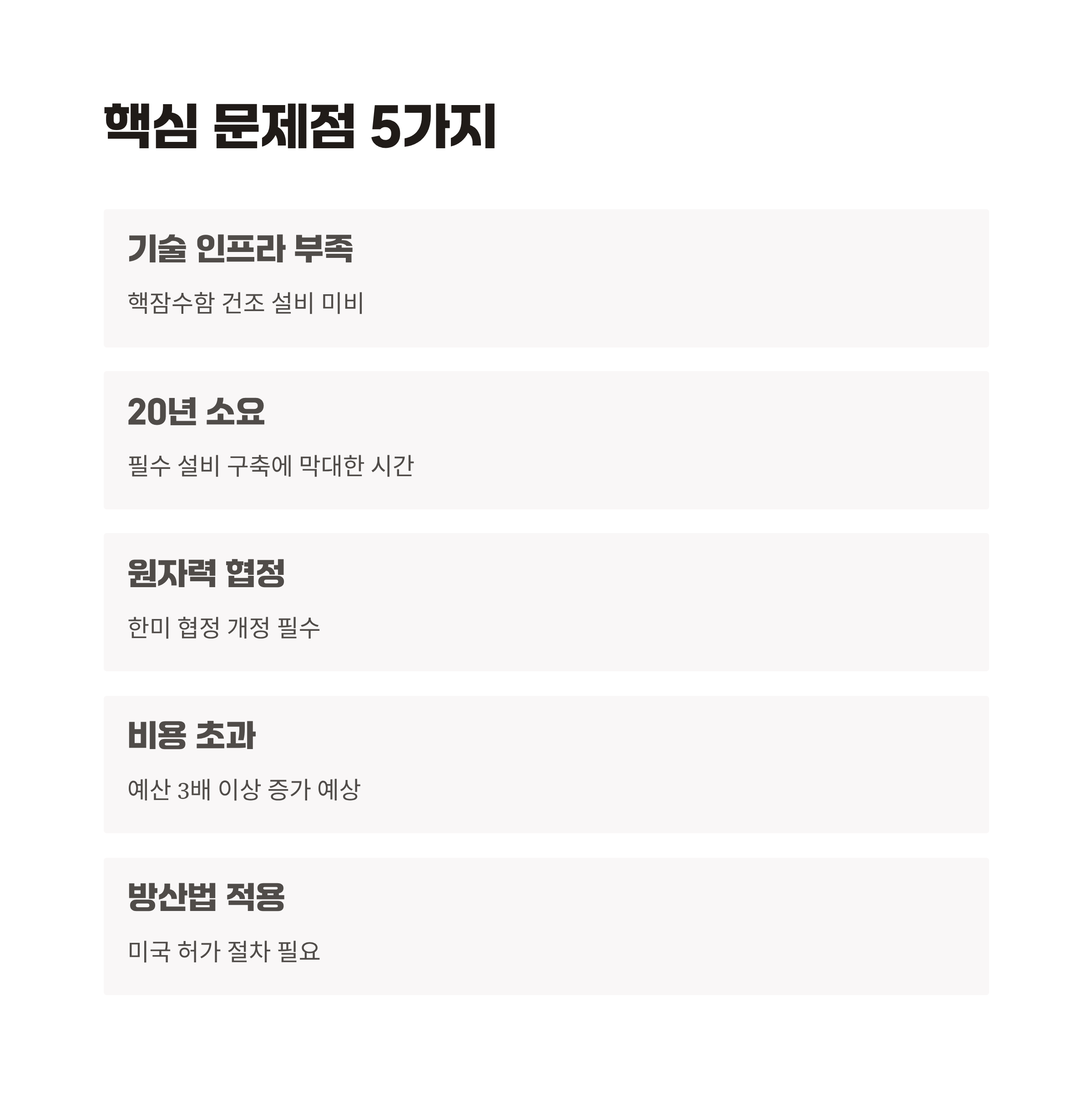 한미 원자력 협정의 조건 및 미국의 방산법 적용으로 인해 관련 협정 개정 및 추가 비용이 발생할 가능성이 높습니다.