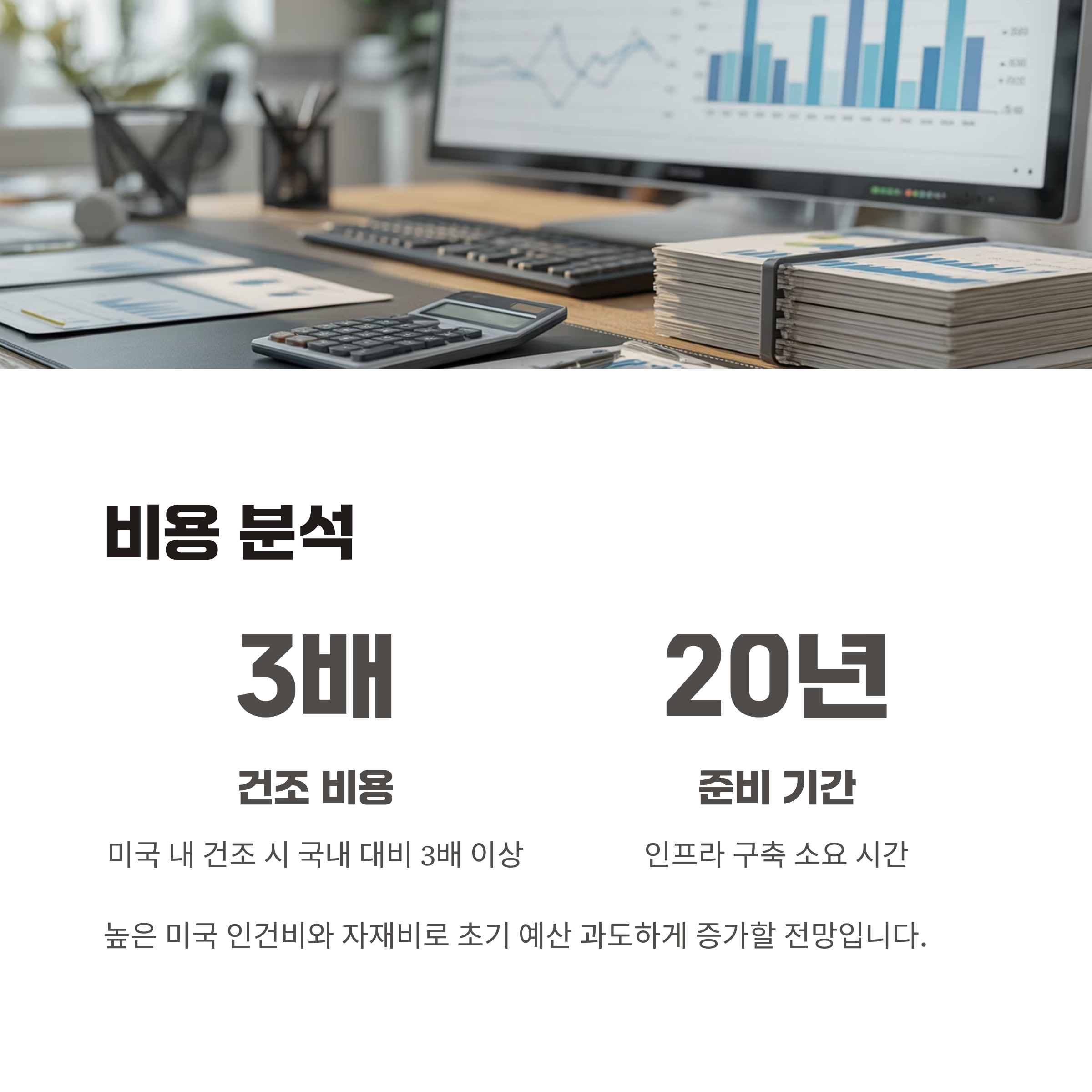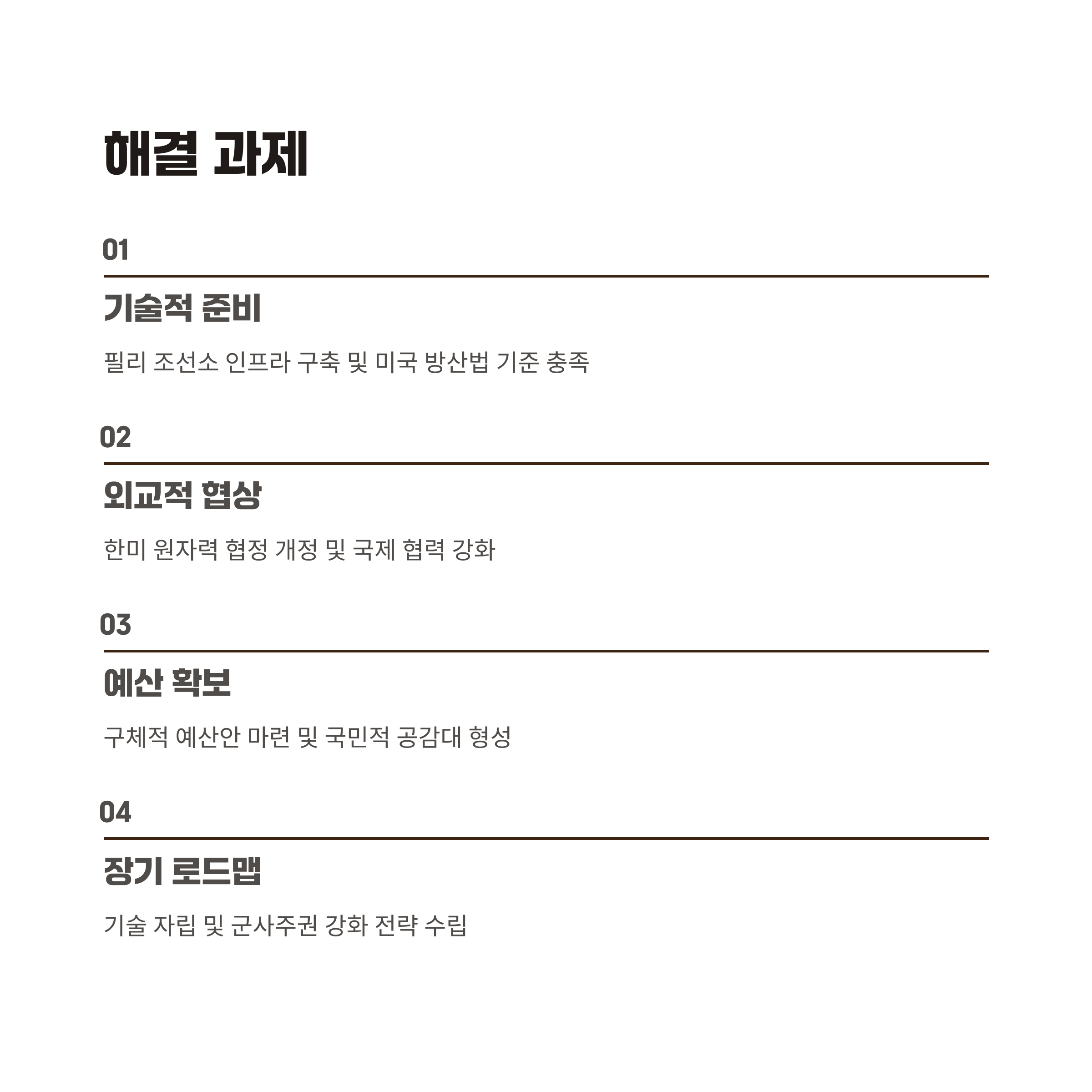 우선적으로 필리 조선소의 기술적 준비 부족과 미국 방산법 기준 충족 이슈를 해결해야 하며, 여기에 더해 한미 원자력 협정 개정 등 국제적 협력이 필수 조건입니다. 비용 측면에서도 미국 내 건조가 국내 대비 3배 이상 높은 비용이 예상되므로, 구체적인 예산안을 마련하고 국민적 공감을 끌어낼 전략적 소통이 필요합니다.