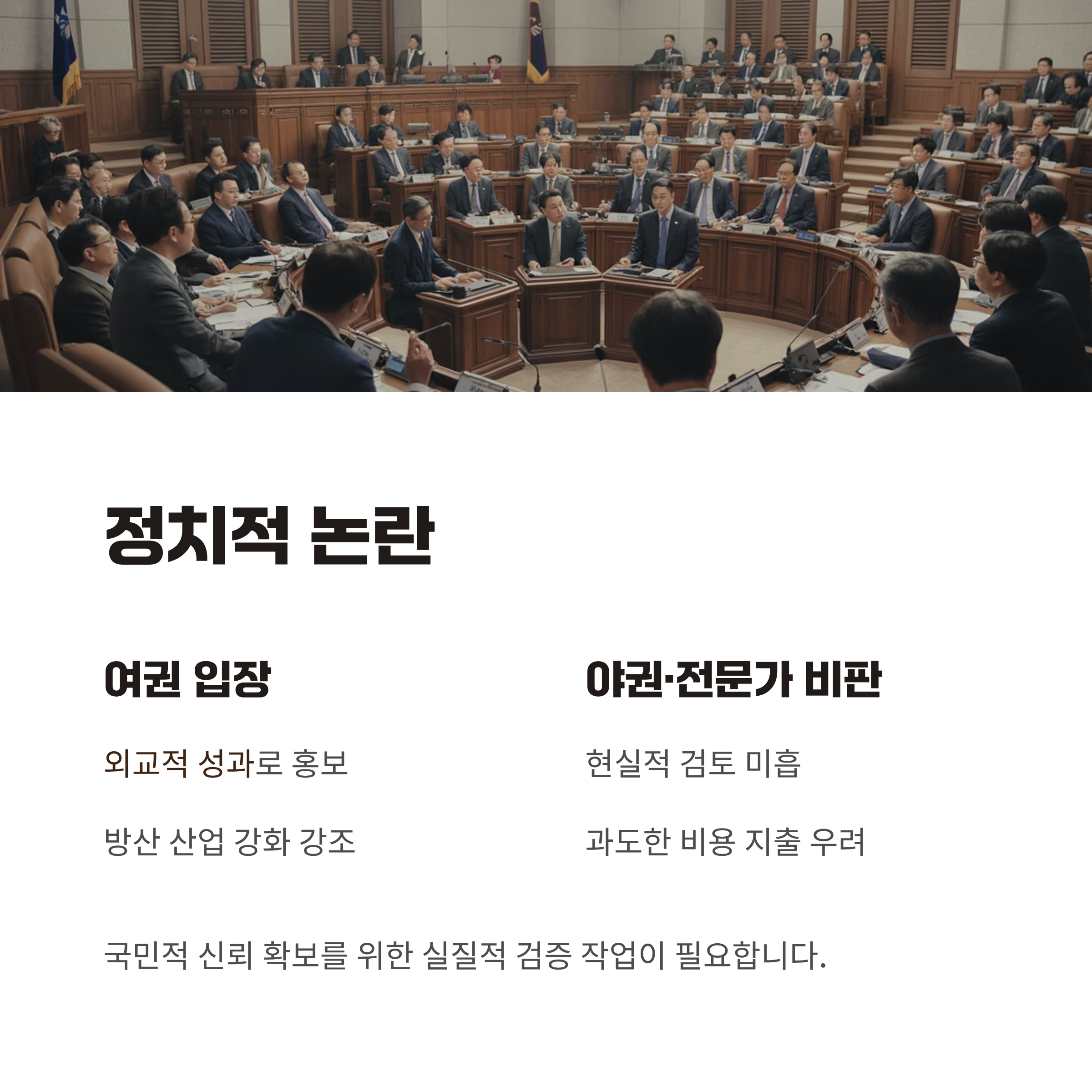 이번 논의는 정치권에서 논쟁의 중심이 되고 있습니다. 여권에서는 이를 외교적 및 방산 산업 강화의 중대한 성과로 홍보하는 반면, 현실적 검토가 미흡하다는 야권과 전문가들의 비판이 이어지고 있습니다. 국민적인 시각에서도 과도한 비용 지출과 불확실성이 논란을 일으키며, 핵추진 잠수함 논의가 제대로 실행되지 않을 경우 신뢰를 잃는 결과를 초래할 우려가 제기되고 있습니다.