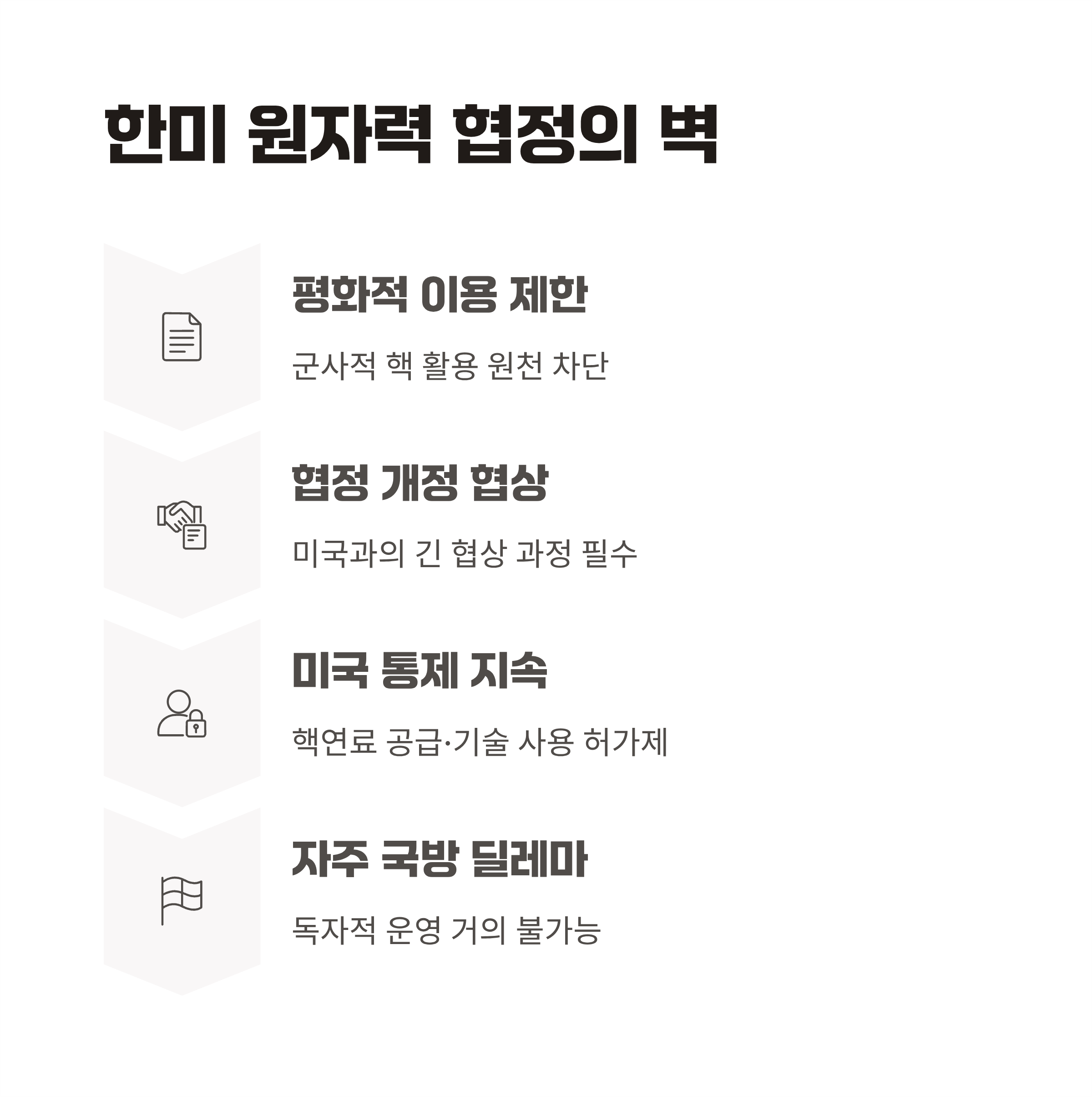 핵연료 사용과 관련된 상위 협정인 한미 원자력 협정은 한국의 핵 관련 군사적 활용을 제약하도록 설계되었습니다. 이 협정은 평화적 원자력 이용에 초점을 맞추고 있으며, 이를 개정하려면 미국과의 긴 협상이 필수적입니다. 설령 협정 개정이 이루어진다 해도 한국은 여전히 핵연료 공급과 기술 사용을 미국 정부의 허가 아래 진행해야 하므로, 독자적 운영이 거의 불가능합니다.