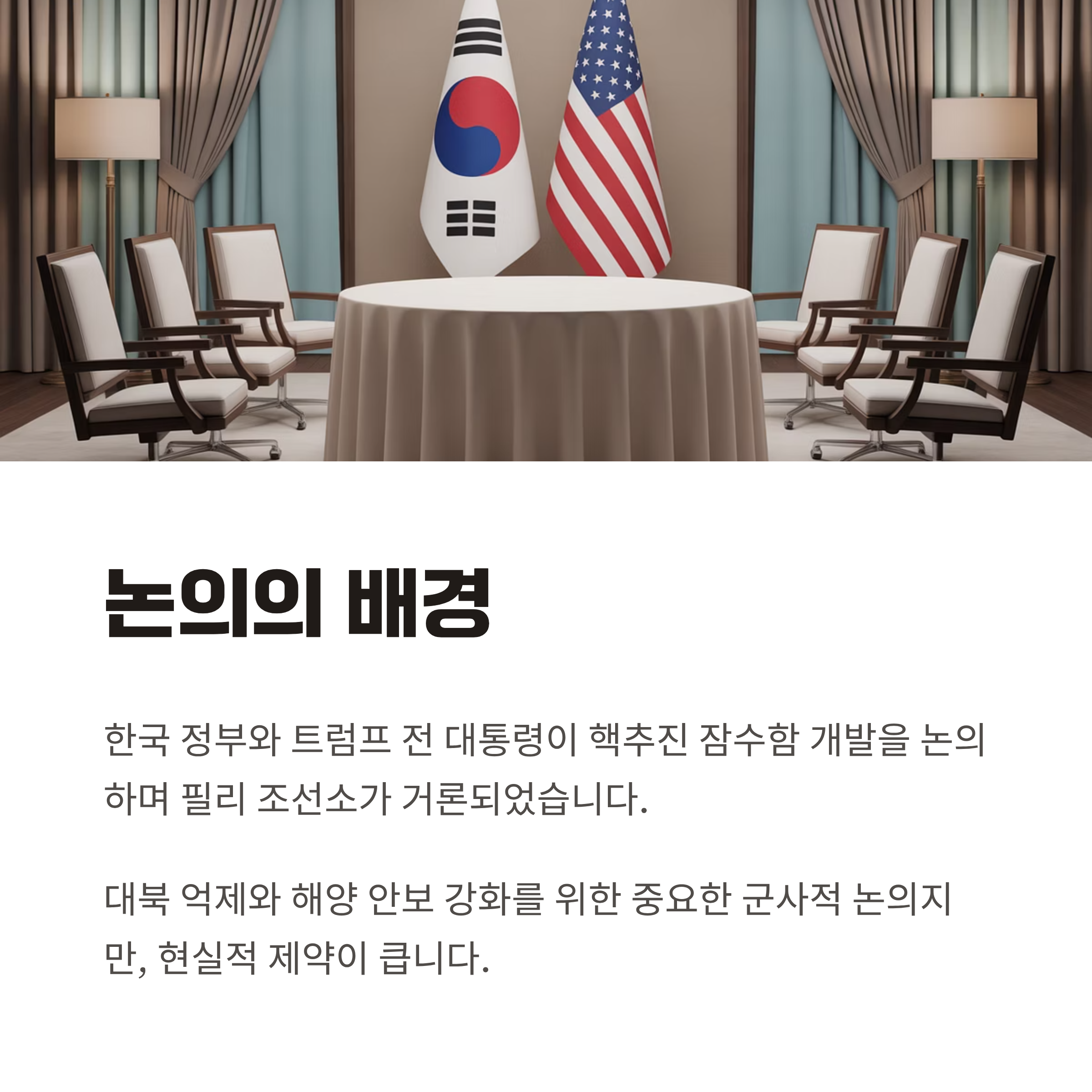 최근 한국 정부와 트럼프 전 미국 대통령이 핵추진 잠수함 개발을 논의하면서 필리 조선소라는 이름이 주목받고 있습니다. 이 논의는 대북 억제와 해양 안보 강화를 위한 중요한 군사적 논의로 보이지만, 필리 조선소가 핵잠수함을 건조할 수 있는 첨단 시설과 기술적 기반을 갖추지 못하고 있다는 점에서 큰 논란을 일으키고 있습니다. 또한, 한미 원자력 협정과 같은 국제 협정의 복잡성을 고려할 때, 이 프로젝트는 간단히 해결될 문제가 아닙니다. 본 글에서는 현재 상황의 쟁점과 미래 대응 방안에 대해 살펴보겠습니다.