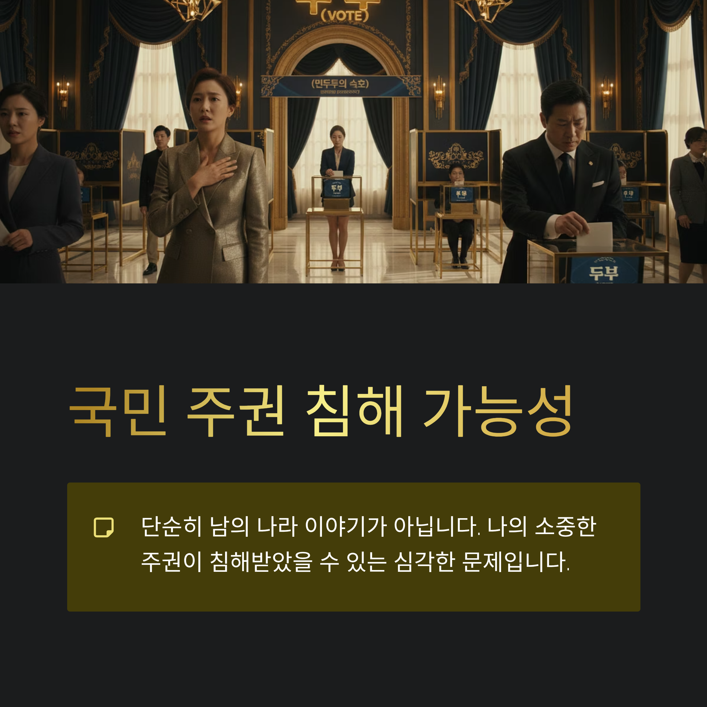 | A. 미국 선거 조작에 한국 기술이 쓰였다면, 한국 내 선거(지난 대선 및 총선) 역시 조작되었을 가능성이 있다는 논리로 이어집니다. 이는 현 이재명 대통령의 당선 정통성에 치명적인 결함이 될 수 있으며, 장동혁 대표가 이끄는 국민의힘 등 야권이 특검이나 국정조사를 요구할 강력한 명분이 됩니다. 결국 한국 선거 제도의 신뢰성 문제로 비화하여 정국에 큰 혼란을 줄 수 있습니다. |