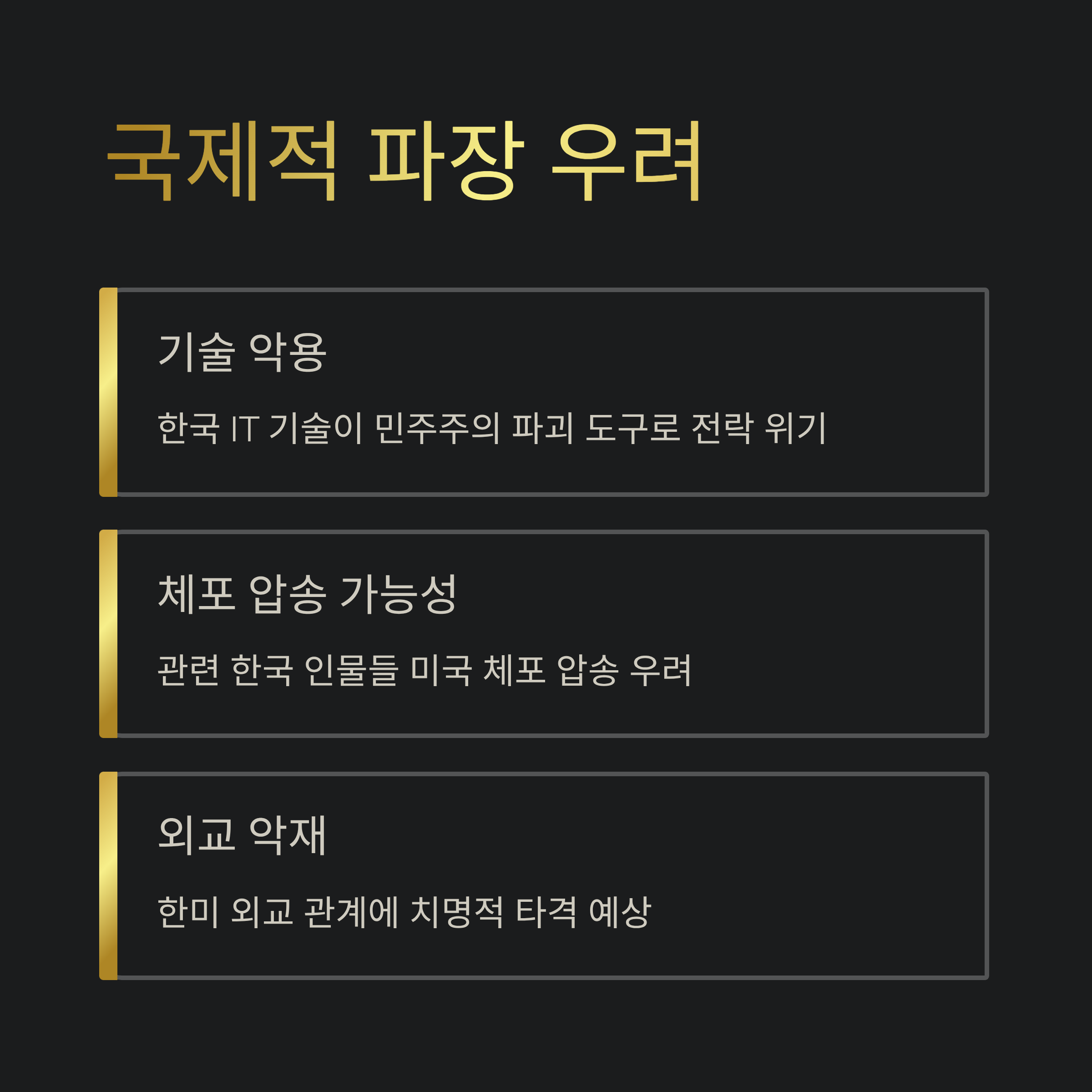 이번 폭로에서 가장 우려스러운 대목은 한국의 '미루시스템즈'가 거론된 점입니다. 트럼프 측 주장에 따르면, 해외(한국)에서 구축된 선거 조작 시스템과 기술이 미국 대선에 투입되었으며, 이를 통해 미국 내 부패 세력과 결탁했다는 것입니다. 미국 검찰이 이미 주 단위 선관위를 급습하여 압수수색을 진행 중인 상황에서, 한국 기업의 개입 정황이 사실로 드러날 경우 해당 기업 관계자는 물론 연루된 한국 내 인물들까지 미국으로 체포 압송될 가능성이 제기됩니다. 이는 한미 외교 관계에 치명적인 악재가 될 수 있으며, 한국의 IT 기술이 민주주의 파괴의 도구로 전락했다는 국제적 오명을 쓸 위기에 처했습니다.
