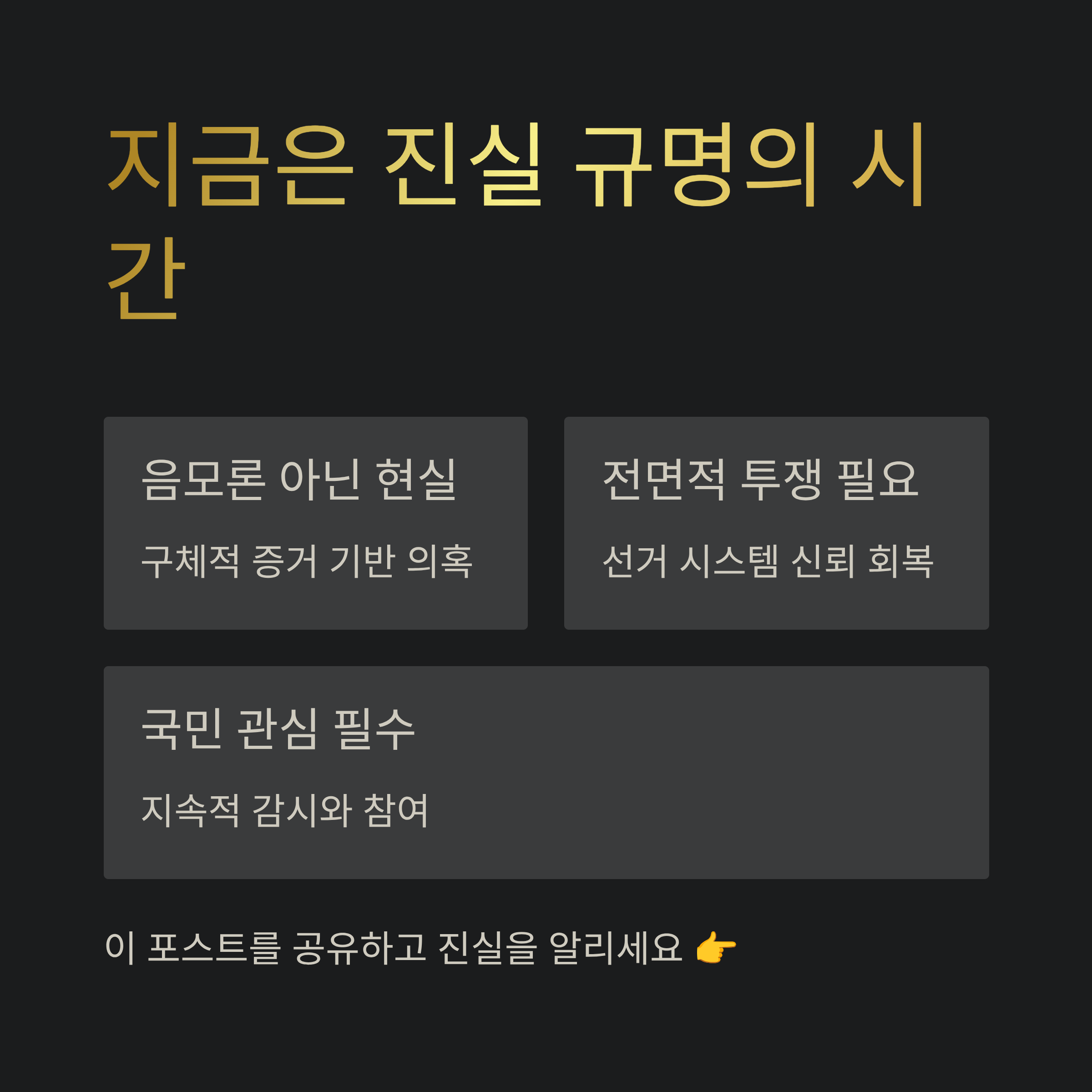- 한국 기업 연루설: 미루시스템즈 등 한국 기술이 미국 선거 조작에 악용되었다는 의혹.
