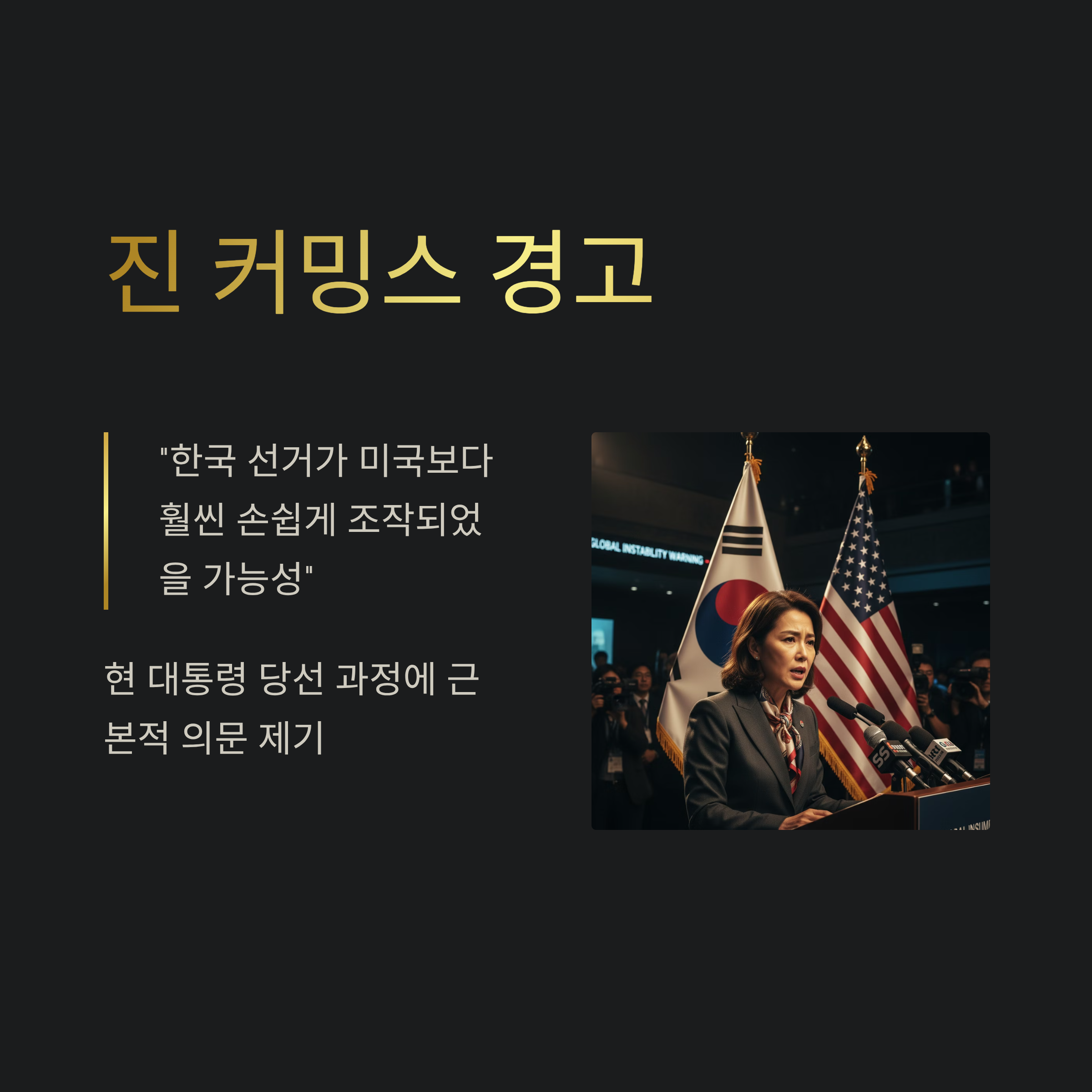 미국의 선거 조작 시스템이 한국 기업을 통해 이루어졌다면, 동일한 시스템이 적용된 한국의 선거 또한 안전하지 않다는 합리적 의심이 가능합니다. 진 커밍스는 한국의 선거가 미국보다 훨씬 손쉽게 조작되었을 가능성을 경고했습니다. 이는 현재 이재명 대통령의 당선 과정에 대한 근본적인 의문을 제기하게 만듭니다. 그럼에도 불구하고 현재 장동혁 대표 체제의 국민의힘 등 야권이 이 문제에 대해 침묵하거나 소극적으로 대응하는 것은 직무 유기라는 비판을 피하기 어렵습니다. 헌정 질서 수호를 위해 국민의힘은 즉각적인 특검법 발의와 국정조사를 통해 지난 대선의 투명성을 검증하고, 정청래 대표가 이끄는 민주당의 저항을 돌파해야 할 정치적 책무가 있습니다.