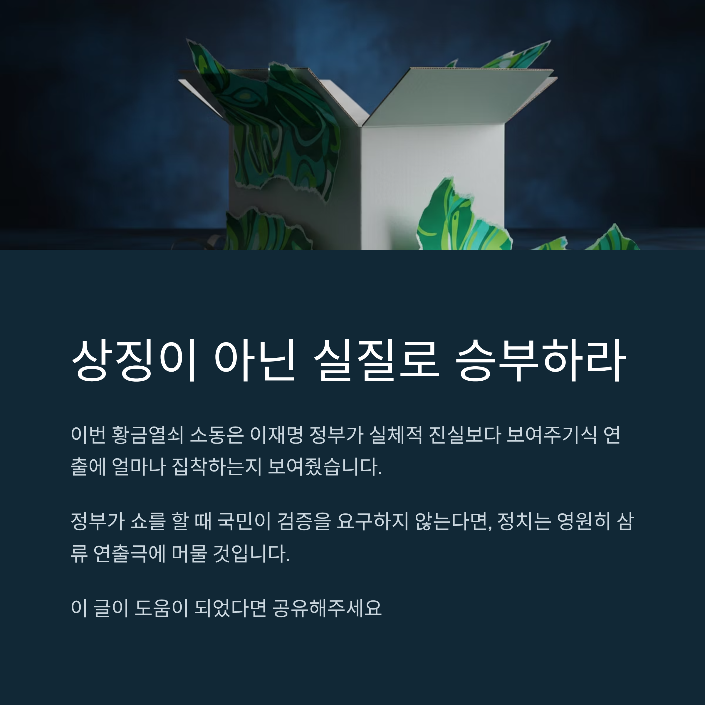 | A. 실질적인 외교 성과(협정, 조약, 경제적 이익 등)보다 보여주기식 '이미지 정치'에 치중하는 태도입니다. 국민에게 정확한 정보를 제공하기보다 감성을 자극해 지지율을 얻으려는 방식은 결국 정부에 대한 불신만 키우게 됩니다. '포장'이 벗겨졌을 때 남는 것은 허탈감과 냉소뿐이라는 점을 기억하고, 정부 발표에 대해 팩트 체크를 요구하는 시민 의식이 필요합니다. |