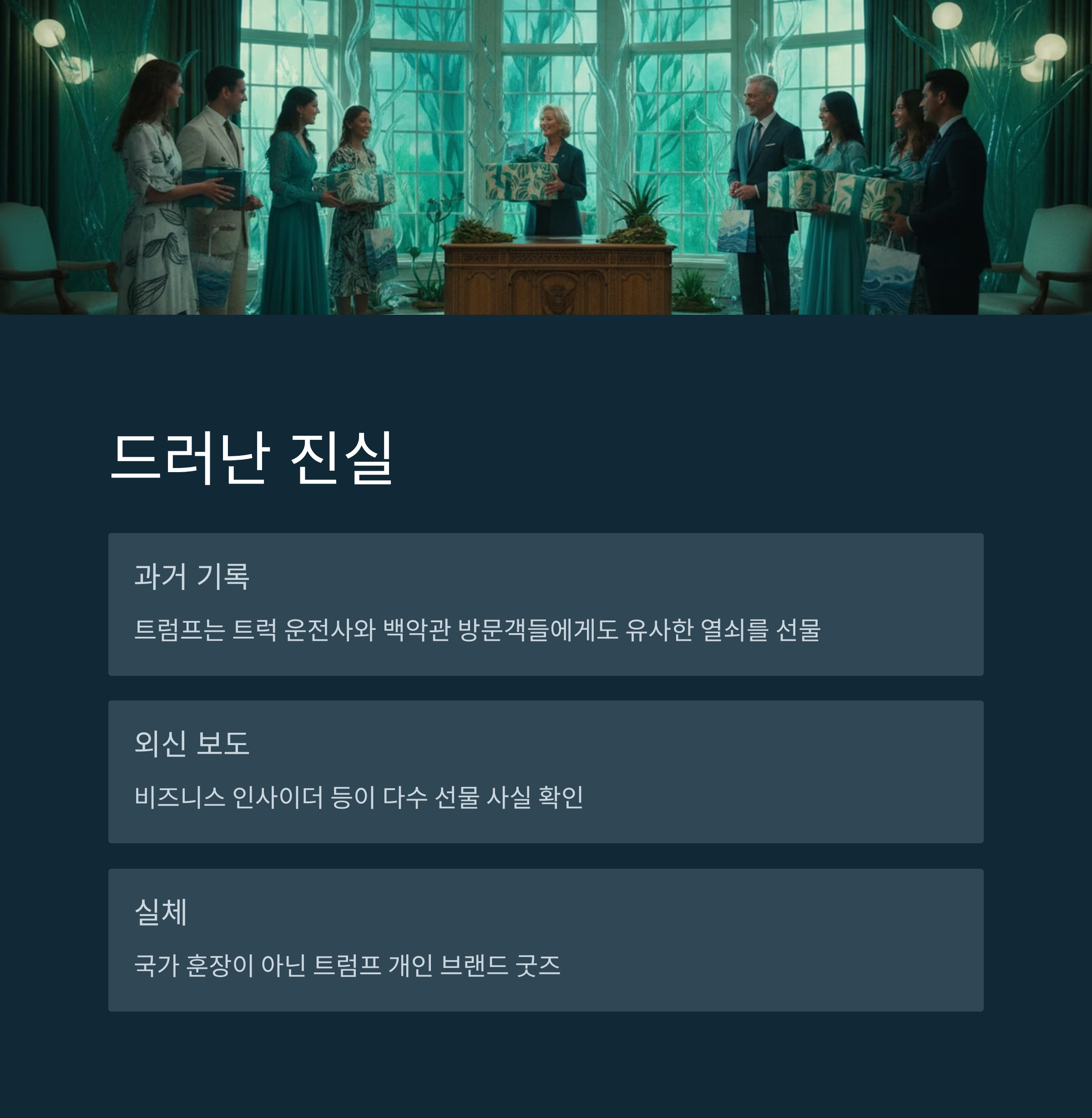 그러나 하루 만에 이러한 발표는 외신 보도와 과거 기록들에 의해 거센 역풍을 맞이하고 있습니다. 트럼프가 과거 재임 시절이나 주요 행사에서 유사한 열쇠 기념품을 다수에게 선물했다는 정황이 드러났기 때문입니다. 이번 글에서는 대통령실이 국가 외교를 홈쇼핑의 '매진 임박' 상품처럼 홍보하려 했던 전략의 문제점을 분석합니다. 나아가 감성적인 '포장 정치'가 어떻게 국민의 신뢰를 무너뜨리는지, 그리고 우리가 진짜 주목해야 할 외교의 본질은 무엇인지 짚어보겠습니다.