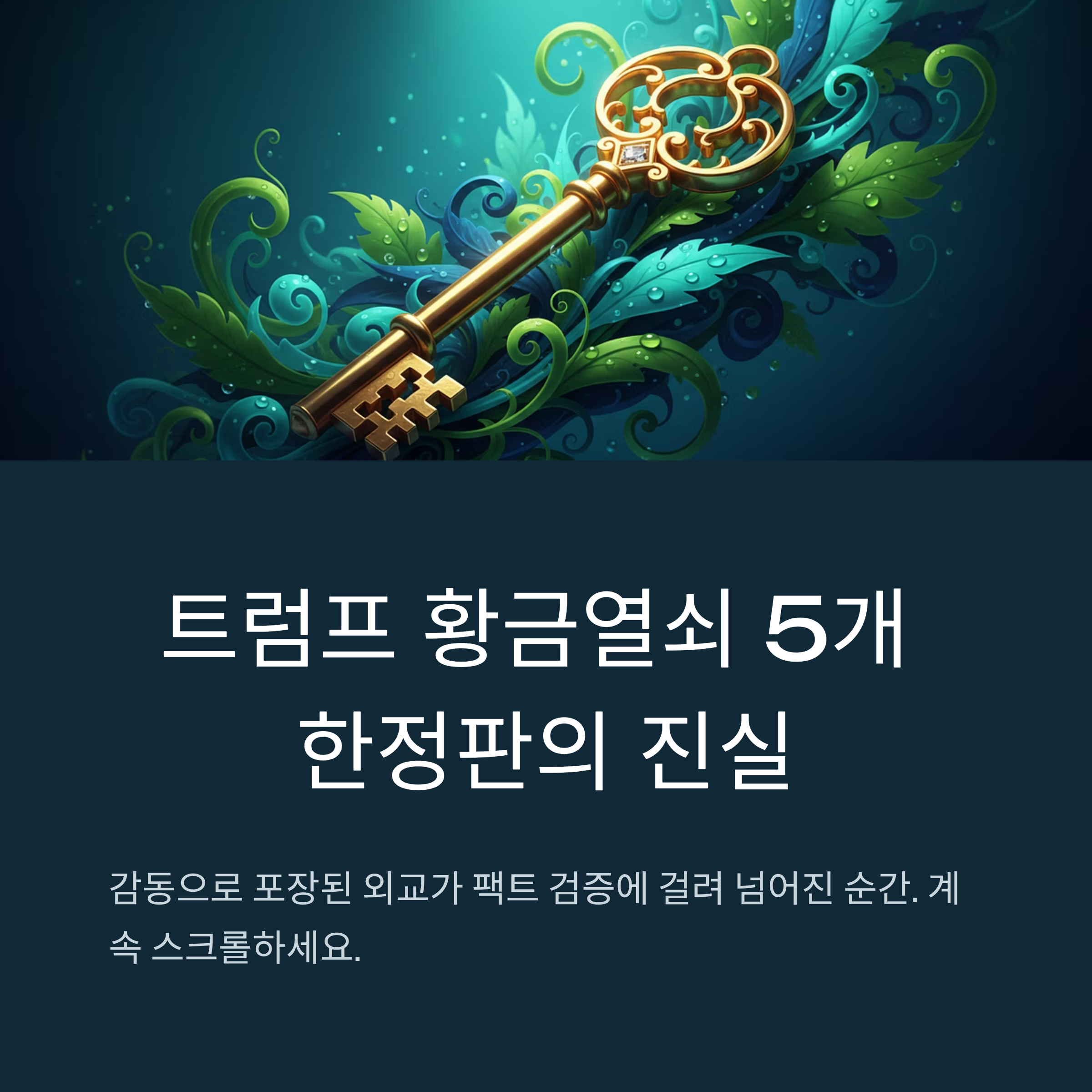 우리는 이제 정부가 내미는 화려한 포장지를 걷어내고 그 안의 내용물을 직시해야 합니다. 트럼프가 준 것이 열쇠가 5개든 50개든, 그것이 우리의 관세를 낮춰주거나 안보를 보장해주지 않습니다. 보수 우파 시민들은 감성 팔이에 휘둘리지 말고 냉철하게 물어야 합니다. "열쇠 말고 합의문은 어디 있는가?", "사진 말고 실익은 무엇인가?" 정부가 쇼를 할 때 국민이 검증을 요구하지 않는다면, 정치는 영원히 삼류 연출극에 머무를 것입니다. 이제는 상징이 아닌 실질로 승부하는 정직한 외교를 보고 싶습니다.