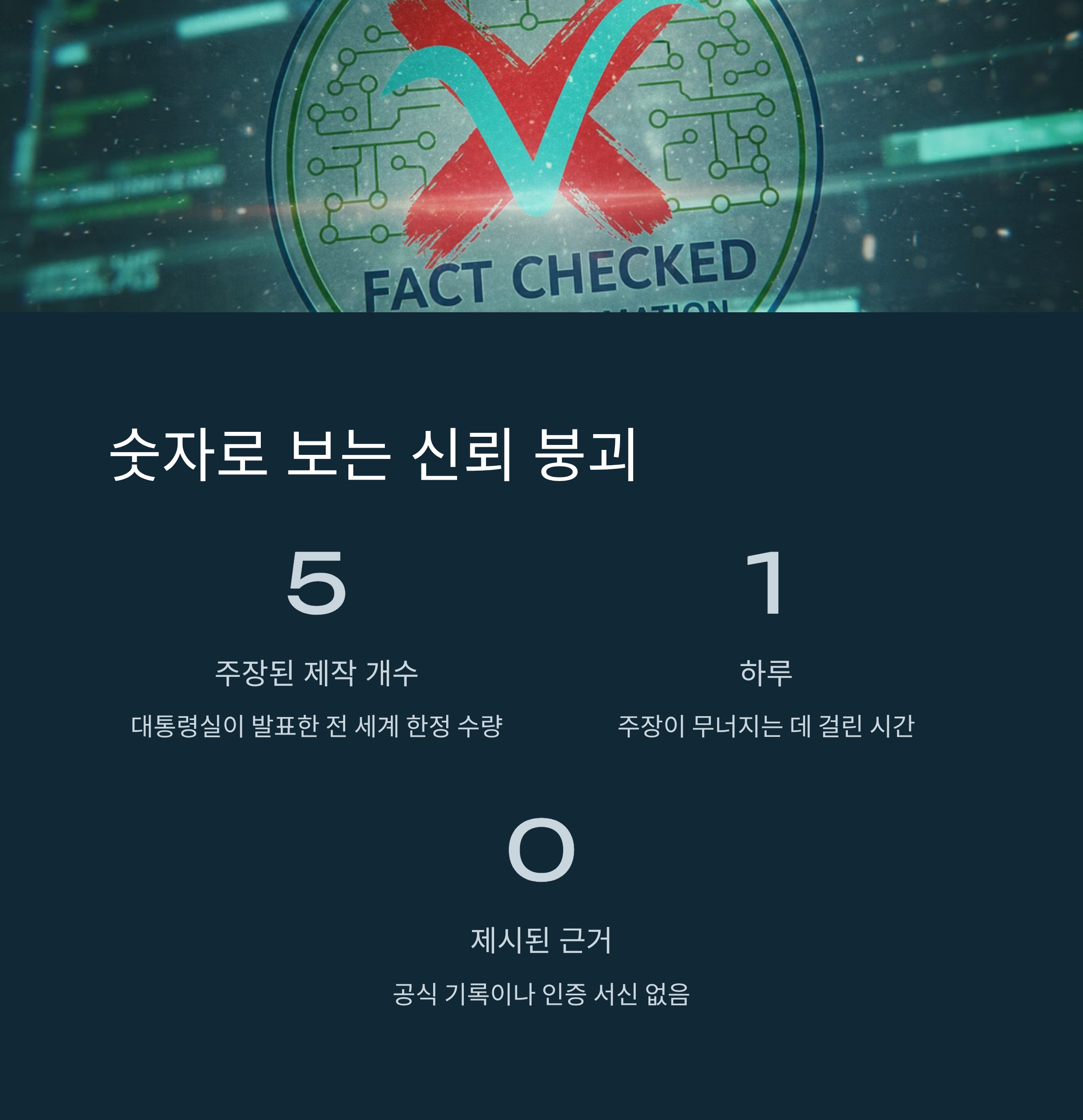 숫자를 제시했다면 그에 합당한 근거가 있어야 합니다. 미국 국무부 의전실의 공식 기록이나 트럼프 측의 인증 서신 등 객관적 증거 없이 SNS에 감성적인 글을 올린 것은 정부의 아마추어리즘을 보여줍니다. 희소성으로 국민의 환심을 사려다, 오히려 인터넷 검색 한 번이면 탄로 날 거짓말을 한 꼴이 되었기 때문입니다. 국가 메시지가 검증의 대상이 되고, 그 검증에서 실패할 때 정부의 권위는 추락합니다. 이는 단순한 실수라기보다, 성과를 부풀리기 위해 사실관계를 왜곡하는 이재명 정부 특유의 홍보 만능주의가 빚어낸 참사입니다.