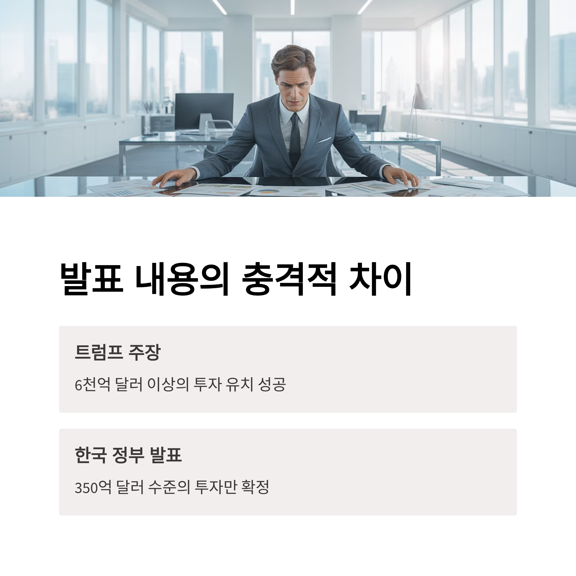 트럼프는 6천억 달러 투자를 주장하며 성과를 강조했으나, 이는 한국 발표와는 명백히 다른 수치를 보여줍니다.