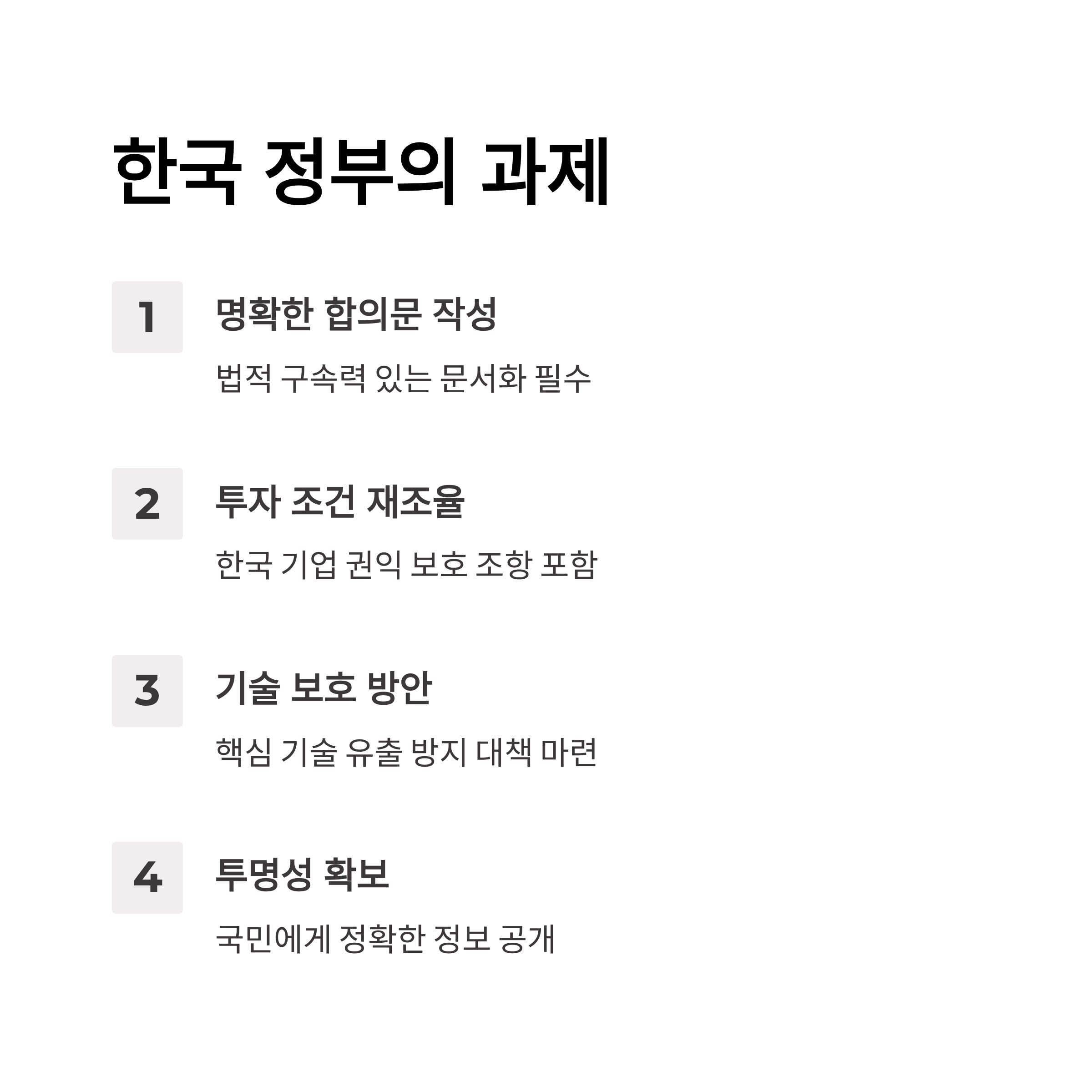 따라서 한국 정부는 이번 협상의 불확실성을 해소하는 방향으로 명확한 합의문 작성과 투자 조건 조율에 나서야 한다. 또한, 외국 자본 유치 과정에서 국내 기업의 권리와 이익이 보호받을 수 있도록 구체적인 정책을 마련해야 한다. 무엇보다도 국제 협상에서 신뢰와 투명성을 유지하는 것은 상호 이익을 실현할 수 있는 핵심 요소라는 점에서 더욱 철저히 준비해야 할 것이다.