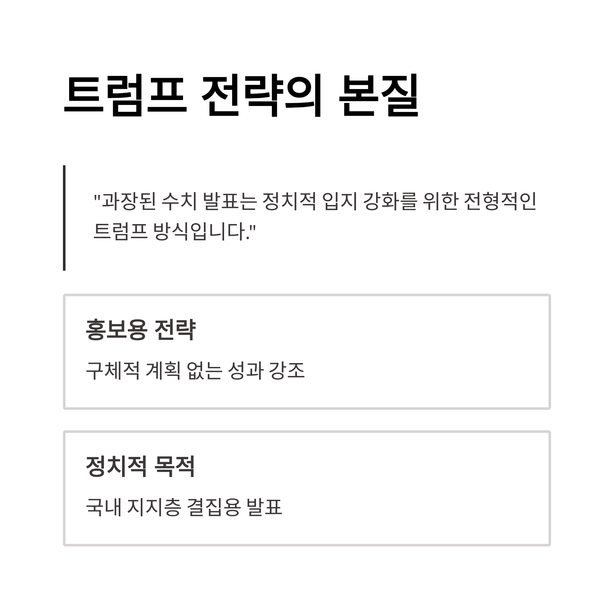| A. 트럼프의 발표는 구체적인 투자처와 계획을 생략한 채 과장된 수치를 공개하는 경우가 많습니다. 이는 정치적 성과를 강조하려는 전략일 가능성이 높습니다. |
