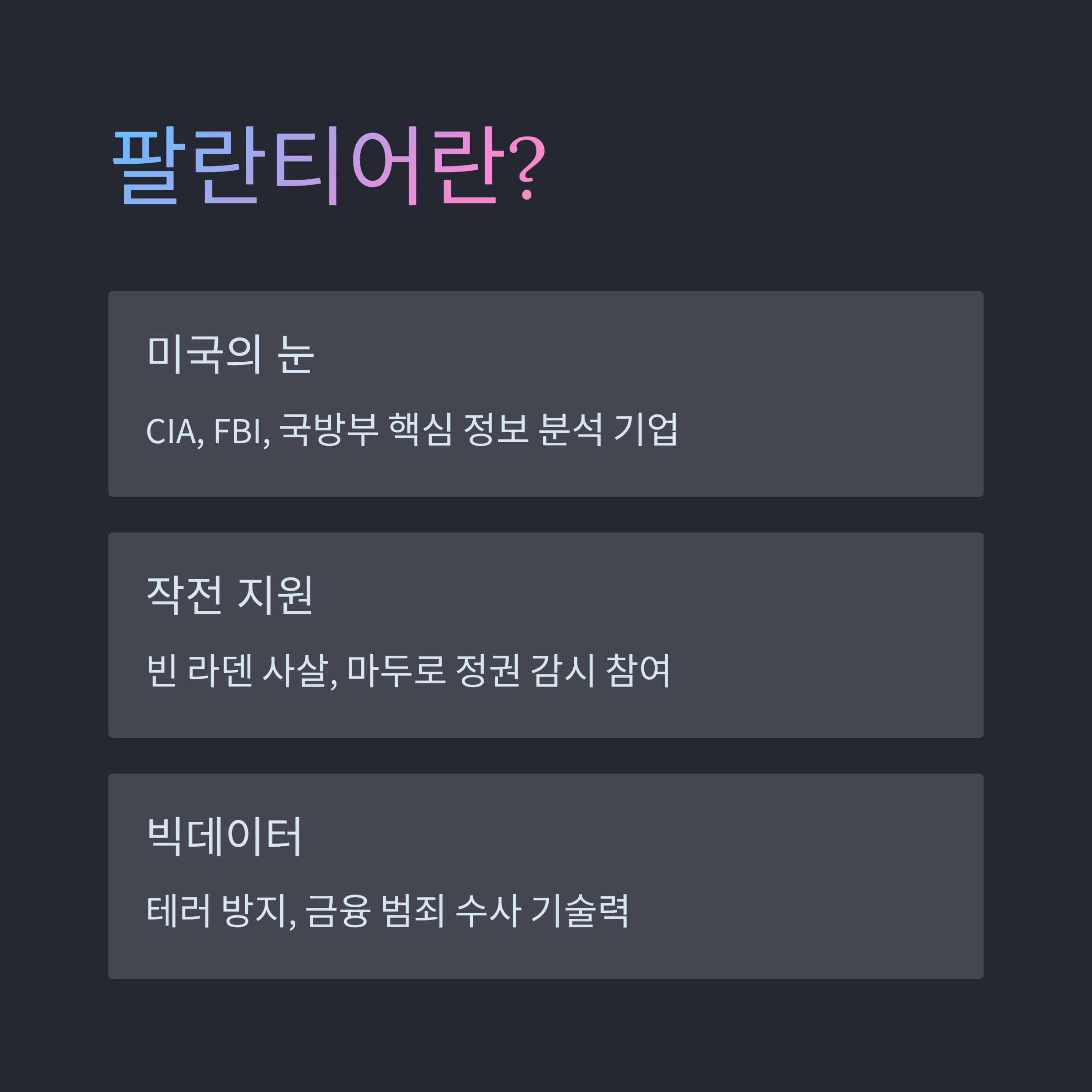 | A. 미국의 빅데이터 분석 기업으로, CIA와 FBI, 국방부 등에 소프트웨어를 제공하는 핵심 안보 기술 기업입니다. 테러 방지, 금융 범죄 수사, 전장 정보 분석 등에 탁월한 기술력을 보유하고 있어 미국의 '정보 자산'으로 불립니다. |