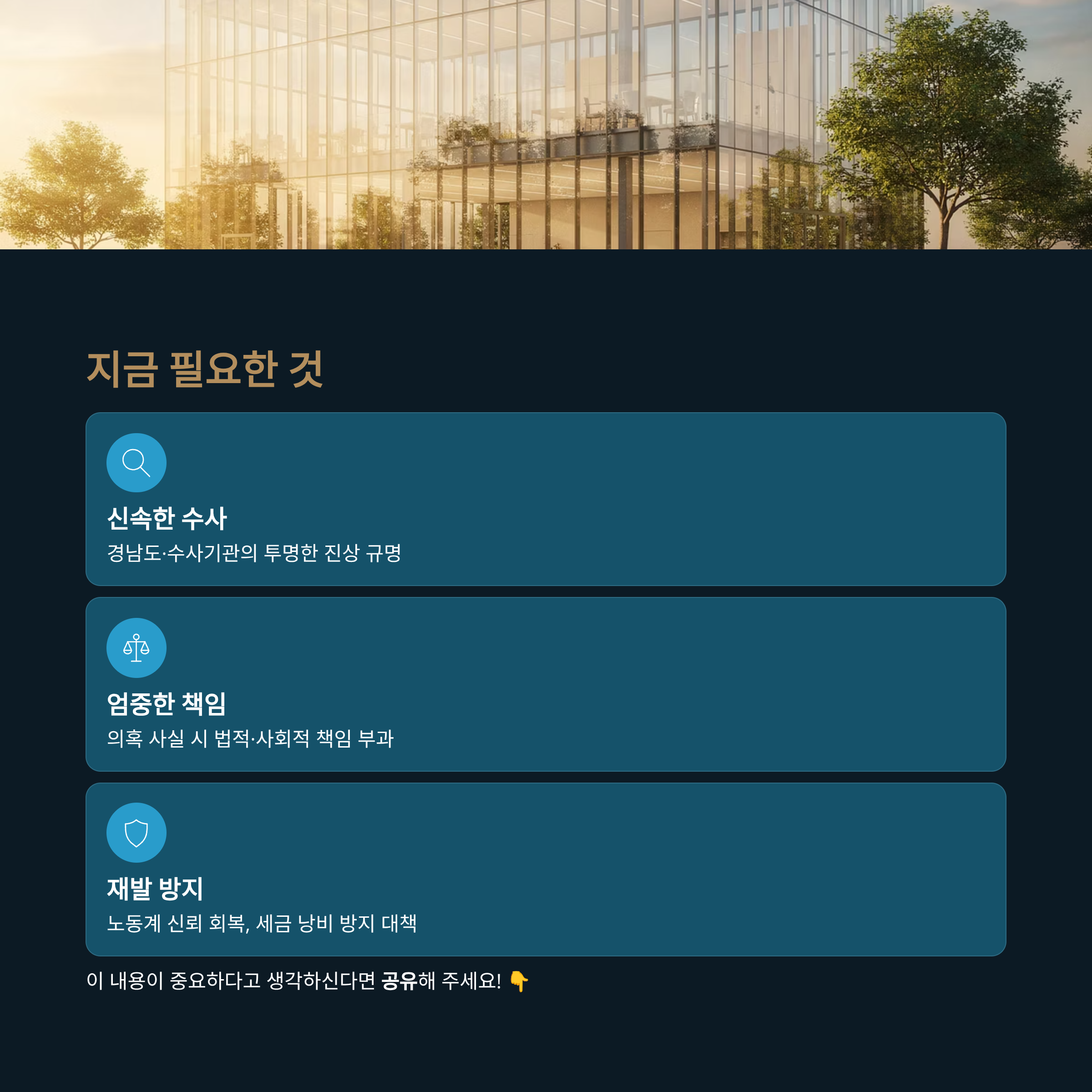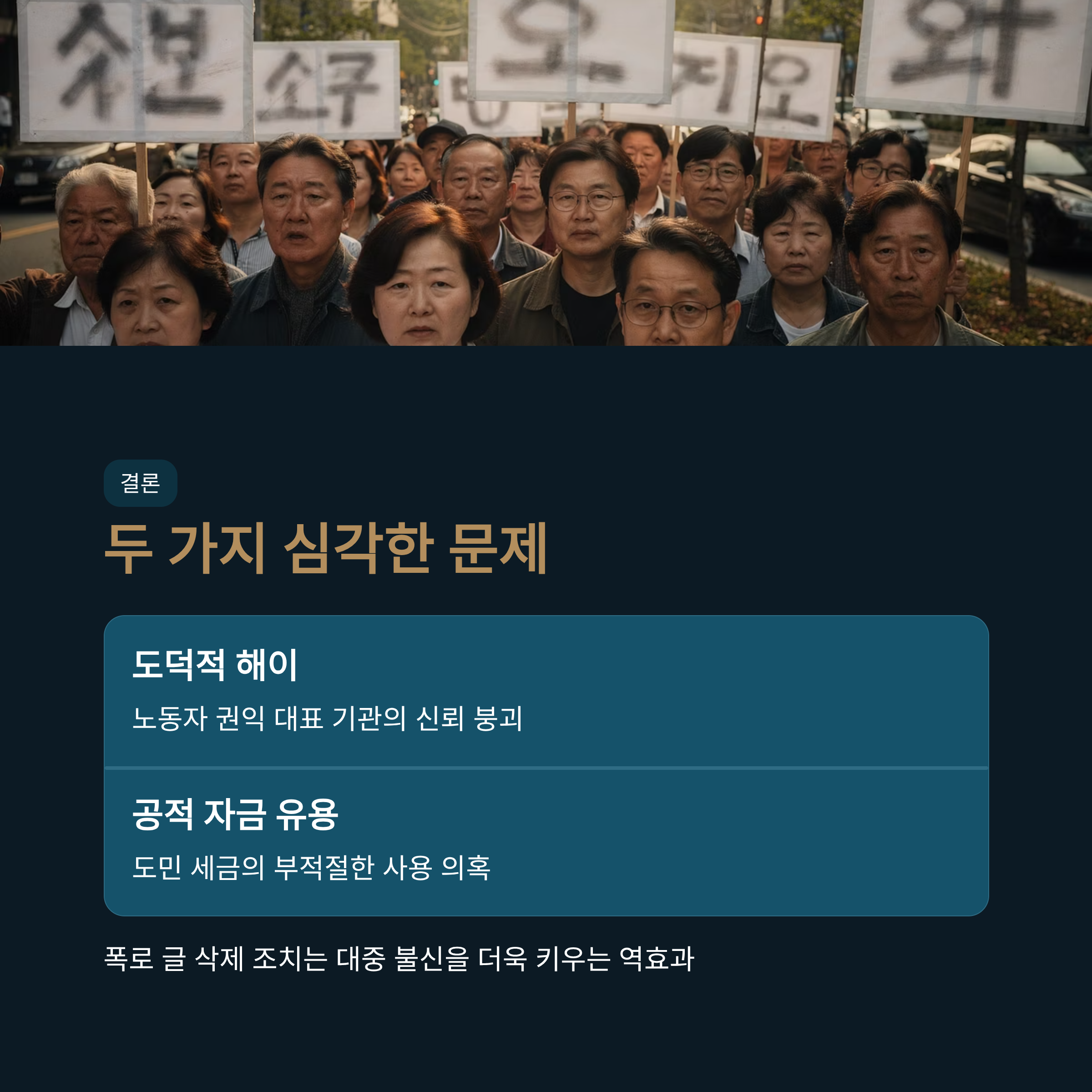사회적 파장: 노동조합의 도덕성과 공공 예산 사용 투명성이 도마 위에 오르며, 철저한 진상 조사가 필요하다는 의견이 강하게 제기되었습니다.