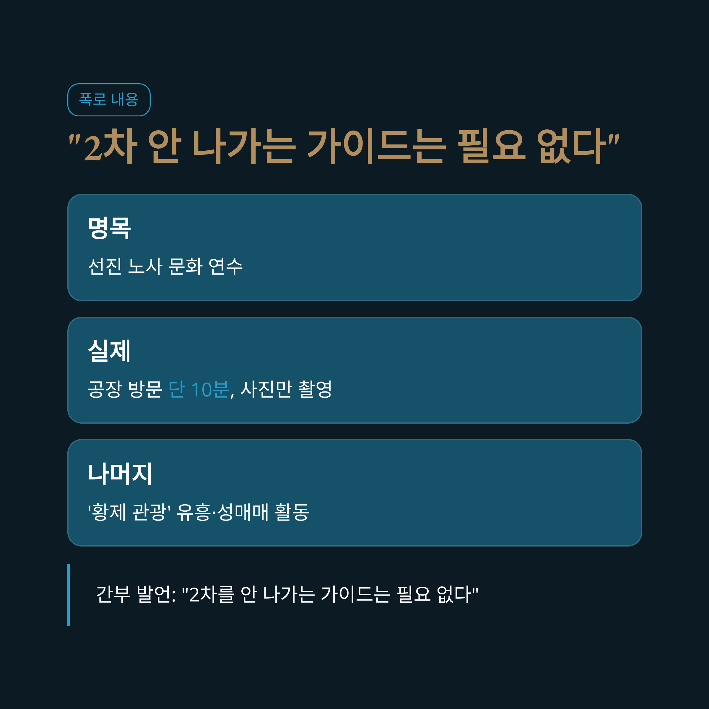 이번 사건은 베트남 현지 여행 가이드가 한국노총 내부 게시판에 올린 폭로 글로 시작되었습니다. 가이드에 따르면, 연수단은 '선진 노사 문화 연수'라는 명목과 달리, 베트남 현지 공장 방문은 단 10분 만에 사진만 찍고 끝냈다고 합니다. 이후 일정은 대부분 '황제 관광'이라 불리는 유흥과 성매매 관련 활동으로 채워졌다고 주장했습니다. 특히 "2차(성매매)를 안 나가는 가이드는 필요 없다"는 등 노조 간부들의 발언까지 구체적으로 언급하며, 연수의 본질이 완전히 변질되었음을 시사했습니다. 이 글은 게시 직후 빠르게 삭제되었지만, 이미 캡처되어 온라인상에 퍼지면서 오히려 의혹을 증폭시키는 결과를 낳았습니다.