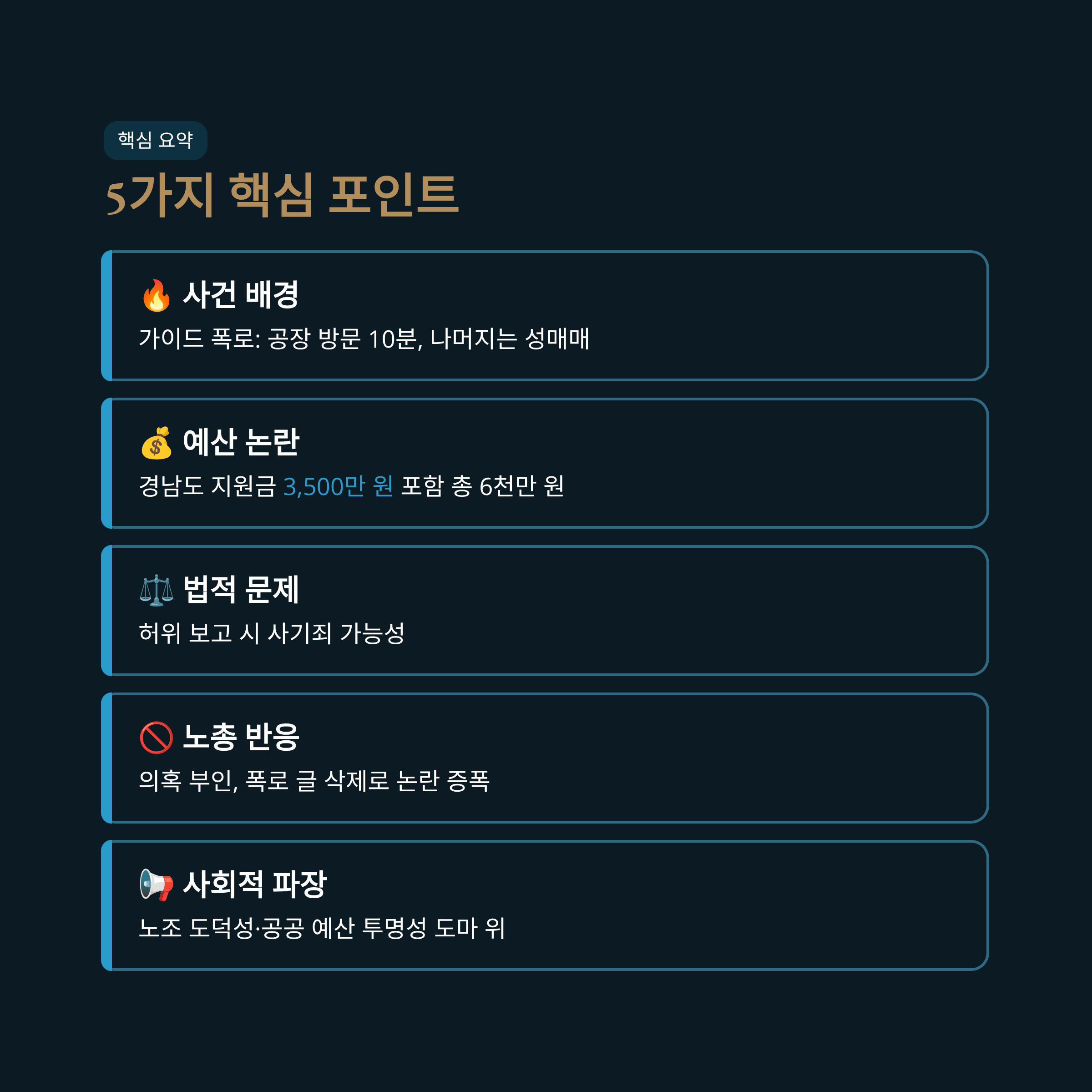 이번 한국노총 경남본부의 베트남 연수 논란은 노동자의 권익을 대표해야 할 노동조합의 도덕적 해이와 공적 자금 유용이라는 두 가지 심각한 문제를 동시에 드러냈습니다. '선진 노사 문화 연수'라는 명분은 현지 가이드의 폭로로 인해 빛이 바랬고, 그 자리는 성매매와 외유성 관광 의혹으로 채워졌습니다. 한국노총 측의 부인과 내부 조사 약속에도 불구하고, 폭로 글 삭제 조치 등은 대중의 불신을 키우고 있습니다. 이 사건은 단순히 한 지역 본부의 일탈로 치부할 수 없습니다. 경상남도와 수사기관은 신속하고 투명한 조사를 통해 진상을 규명하고, 의혹이 사실일 경우 관련자들에게 엄중한 법적, 사회적 책임을 물어야 합니다. 이를 통해 노동계 전반의 신뢰를 회복하고, 국민의 세금이 낭비되는 일이 없도록 재발 방지 대책을 마련하는 계기로 삼아야 할 것입니다.