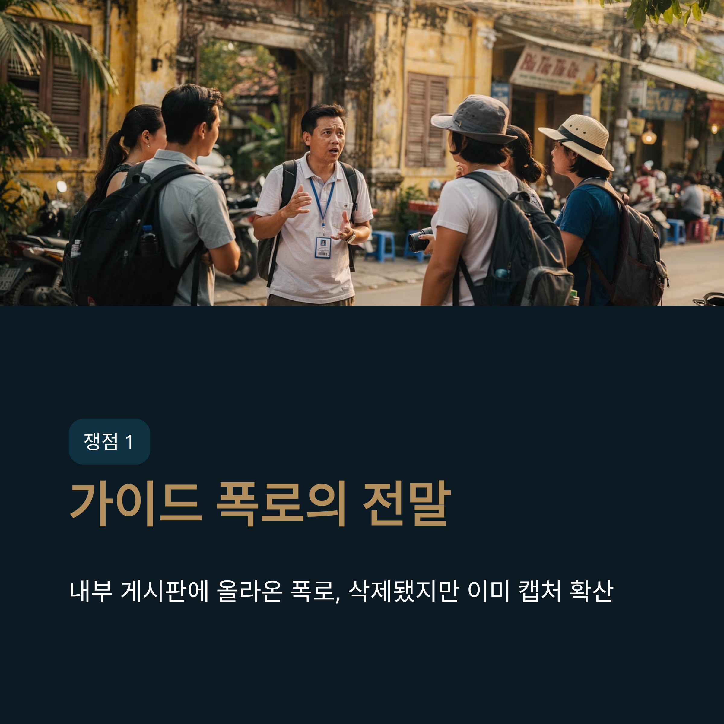 | A. 가이드의 폭로는 연수단의 일정과 발언 등 매우 구체적인 내용을 담고 있어 신빙성이 높게 평가되고 있습니다. 또한, 해당 게시글이 논란이 되자 급히 삭제된 점은 의혹을 더욱 키우는 요소로 작용하고 있습니다. 정확한 사실관계는 수사를 통해 밝혀져야겠지만, 폭로의 구체성 때문에 여론은 쉽게 가라앉지 않을 전망입니다. |