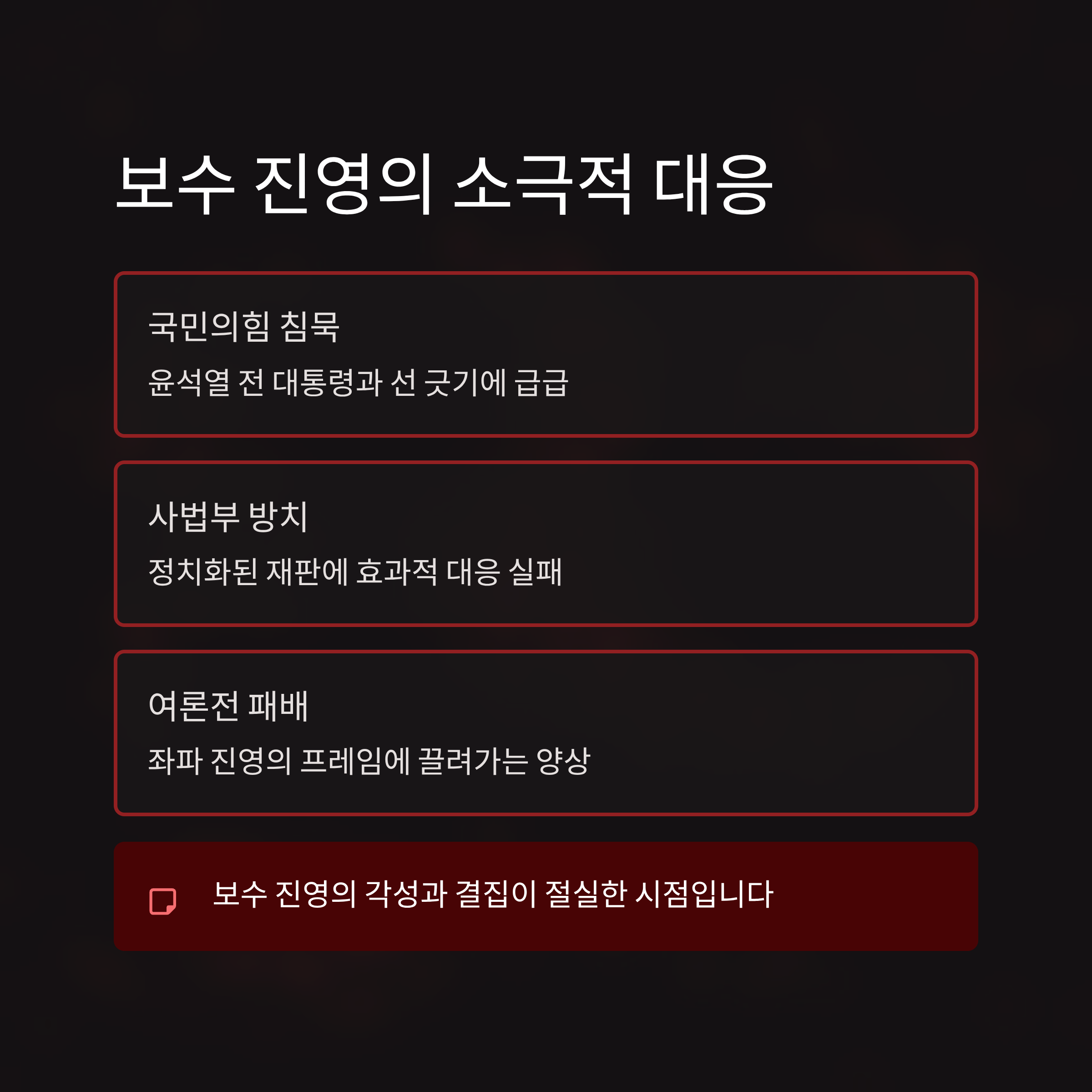 - 4. 결론: 사법부의 좌경화 우려와 보수 우파 진영에 대한 각성 촉구