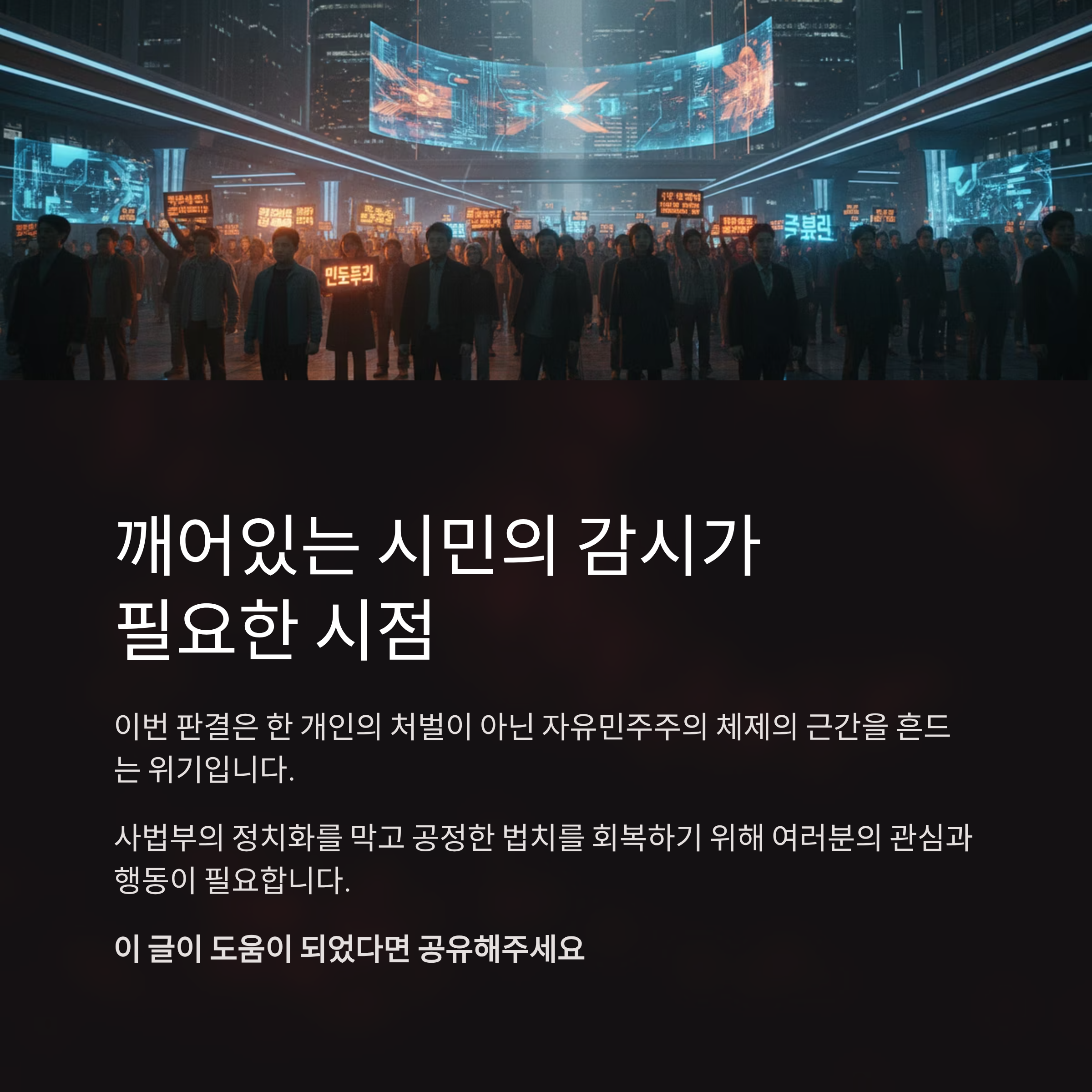 지금의 사법부는 '법치'라는 이름으로 포장된 정치 보복의 도구로 전락할 위기에 처해 있습니다. 국민의힘을 비롯한 보수 진영이 이번 판결에 대해 소극적으로 대응하며 윤석열 전 대통령과 선을 긋는 동안, 사법부 내 특정 세력은 거침없이 자신들의 정치적 목적을 달성하고 있습니다. 국민 여러분께서는 작금의 사태가 단순히 한 개인의 처벌 문제가 아니라, 자유민주주의 체제의 근간을 흔드는 위기임을 직시해야 합니다. 사법부의 정치화를 막고 공정한 법치를 회복하기 위해 깨어있는 시민들의 감시와 비판이 어느 때보다 절실한 시점입니다.