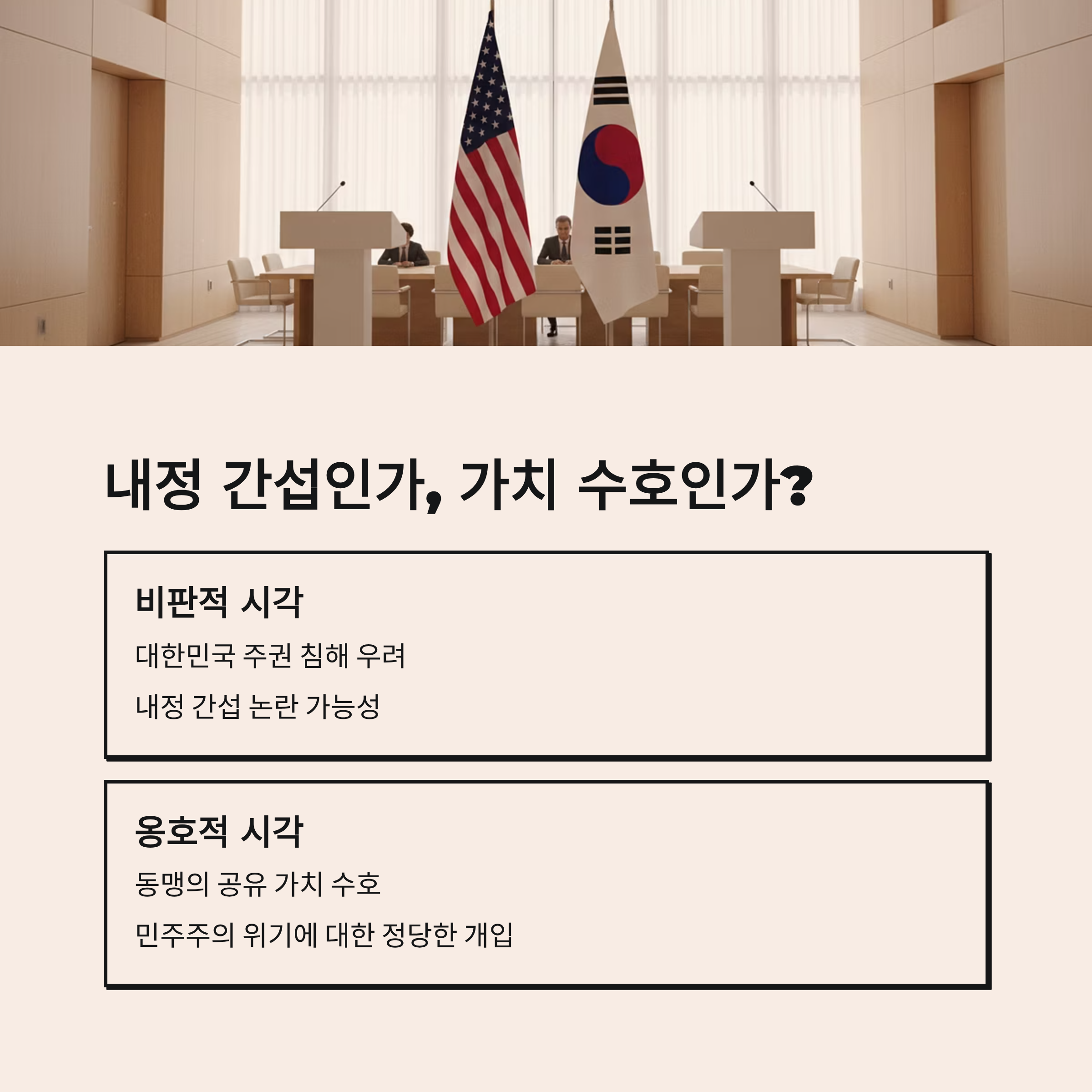 | A. '내정 간섭'이라는 비판이 제기될 수 있으나, 박주현 변호사 측은 이를 '가치 동맹의 수호'라는 관점에서 접근합니다. 한국 사법부의 붕괴가 단순히 국내 문제에 그치지 않고, 민주주의라는 공유 가치와 인도-태평양 지역의 안정을 위협하는 요소로 작용한다면, 동맹국인 미국이 이를 경고하고 개입하는 것은 정당한 외교적, 인권적 조치라는 논리입니다. 즉, 주권 침해가 아닌 동맹의 가치를 지키기 위한 행동으로 보는 것입니다. |
