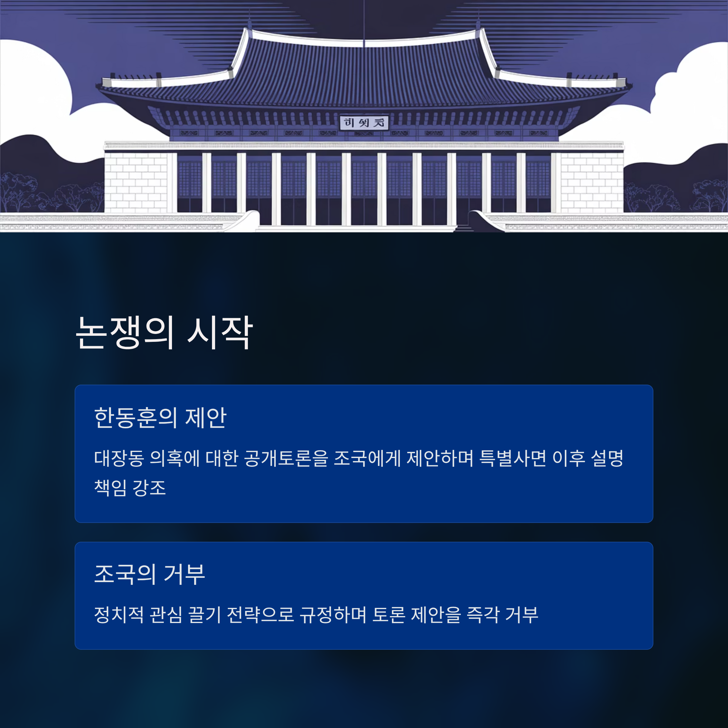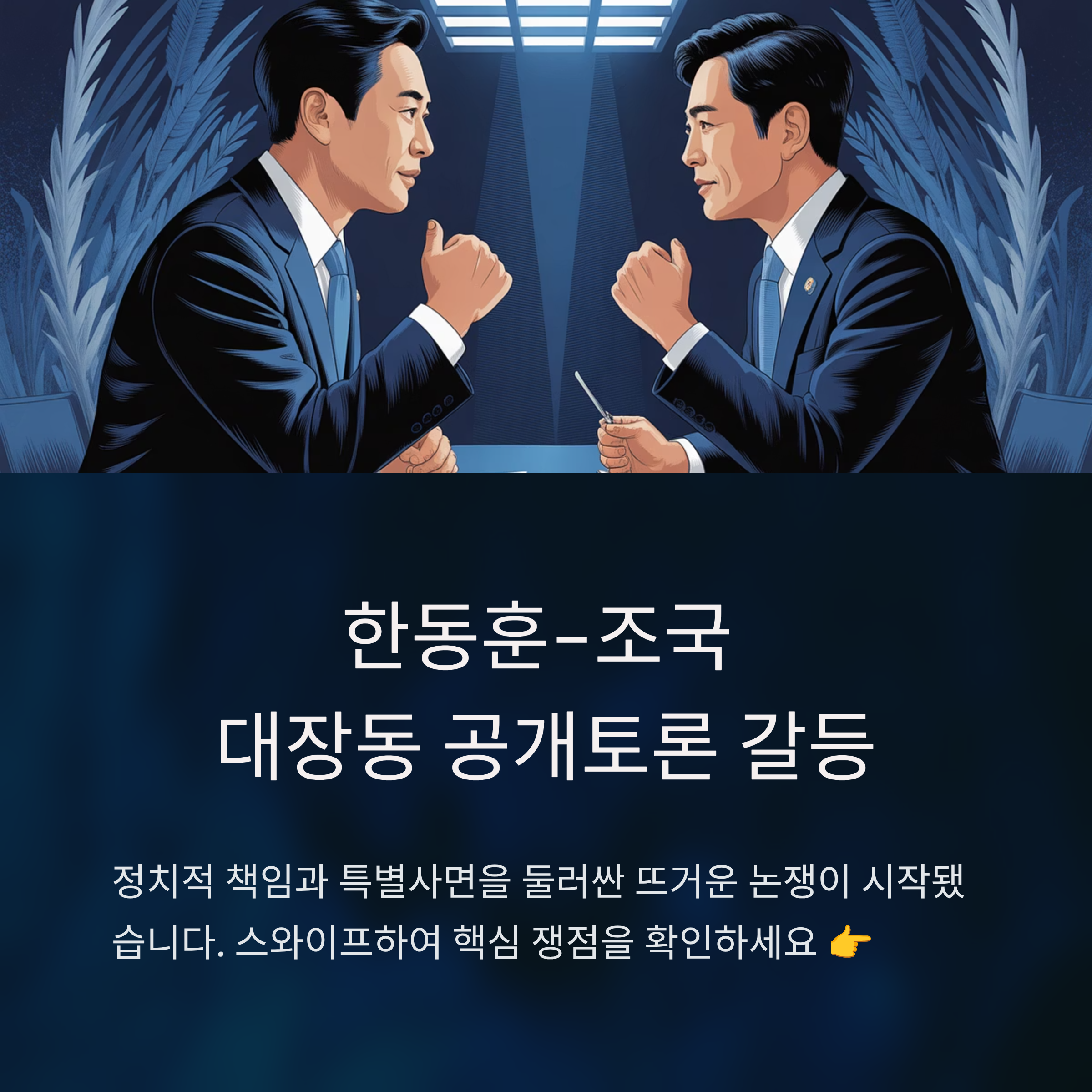 11월 15일, 국내 정치를 뜨겁게 달구는 또 하나의 논쟁이 본격적으로 가시화됐습니다. 한동훈 전 국민의힘 대표와 조국 전 조국혁신당 비대위원장 사이의 대장동 의혹과 관련한 공개토론이 갈등의 중심에 놓여있습니다. 대장동 사건은 한국 정치에서 가장 논란이 되었던 비리 의혹 중 하나로, 이번 공개토론 제안은 단일 정치적 이슈를 넘어 대중적 관심을 끌며 주요 관심사로 떠오르고 있습니다. 한동훈은 조국의 특별사면 이후 정치적 책임과 설명을 촉구했으며, 조국은 이에 대해 강하게 반박하며 거부 입장을 밝혔습니다. 이번 글에서는 양측 입장, 주요 쟁점 분석, 공개토론의 필요성과 그 정치적 의미를 총체적으로 다룰 예정입니다.