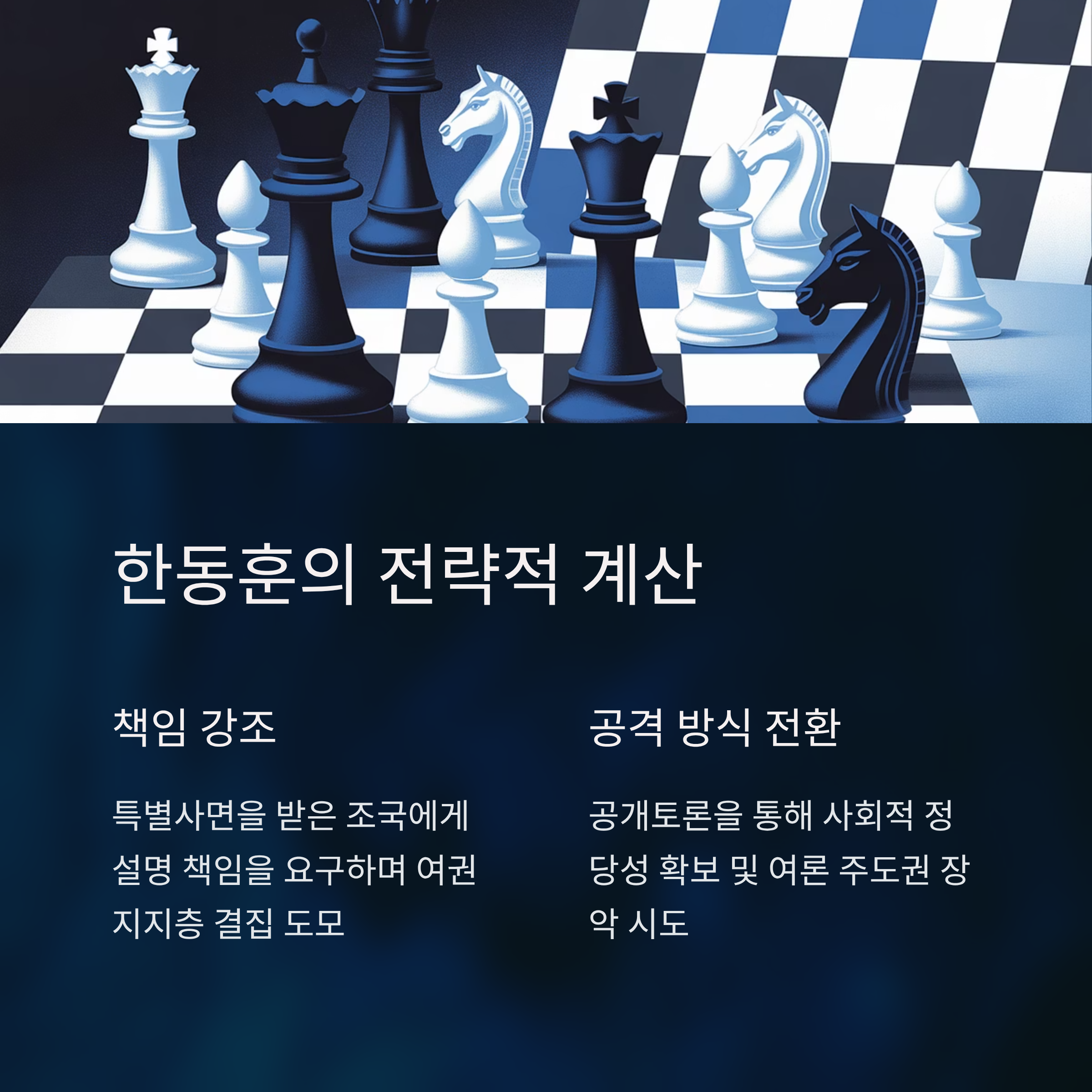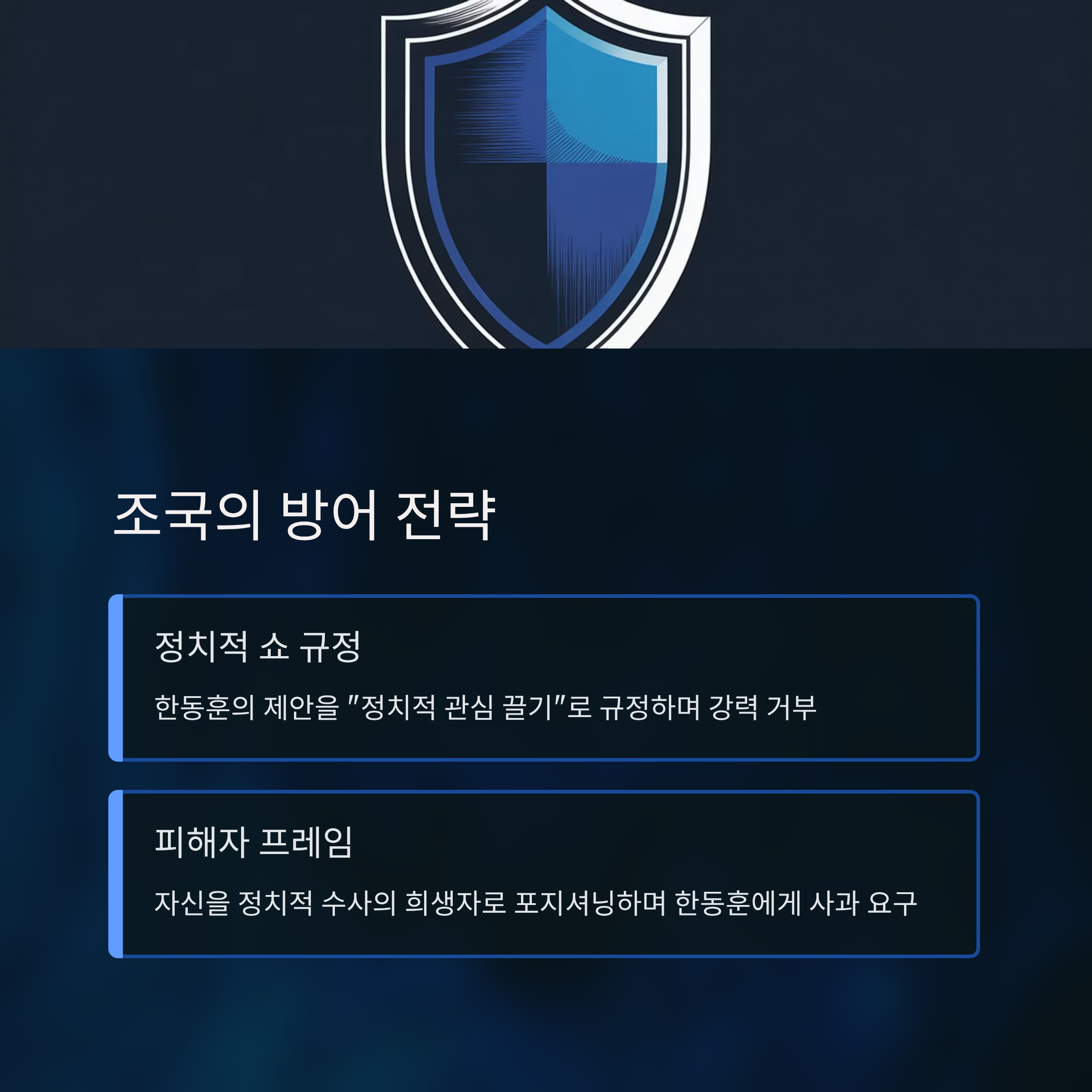 조국은 자신을 정치적 수사의 희생자로 포지셔닝하며 동시에 한동훈에게 사과를 요구하는 역공 전략을 택했습니다. 이는 단순 거부를 넘어 한동훈을 정치적 공격자로 몰아세우며, 역으로 국면을 자신에게 유리하게 전환하려는 노림수로 보입니다. 특히, 특정 시기와 맥락에서 정국을 흔드는 행위를 한동훈의 정치적 계산으로 지적하며 대리적 대응을 시도했습니다.