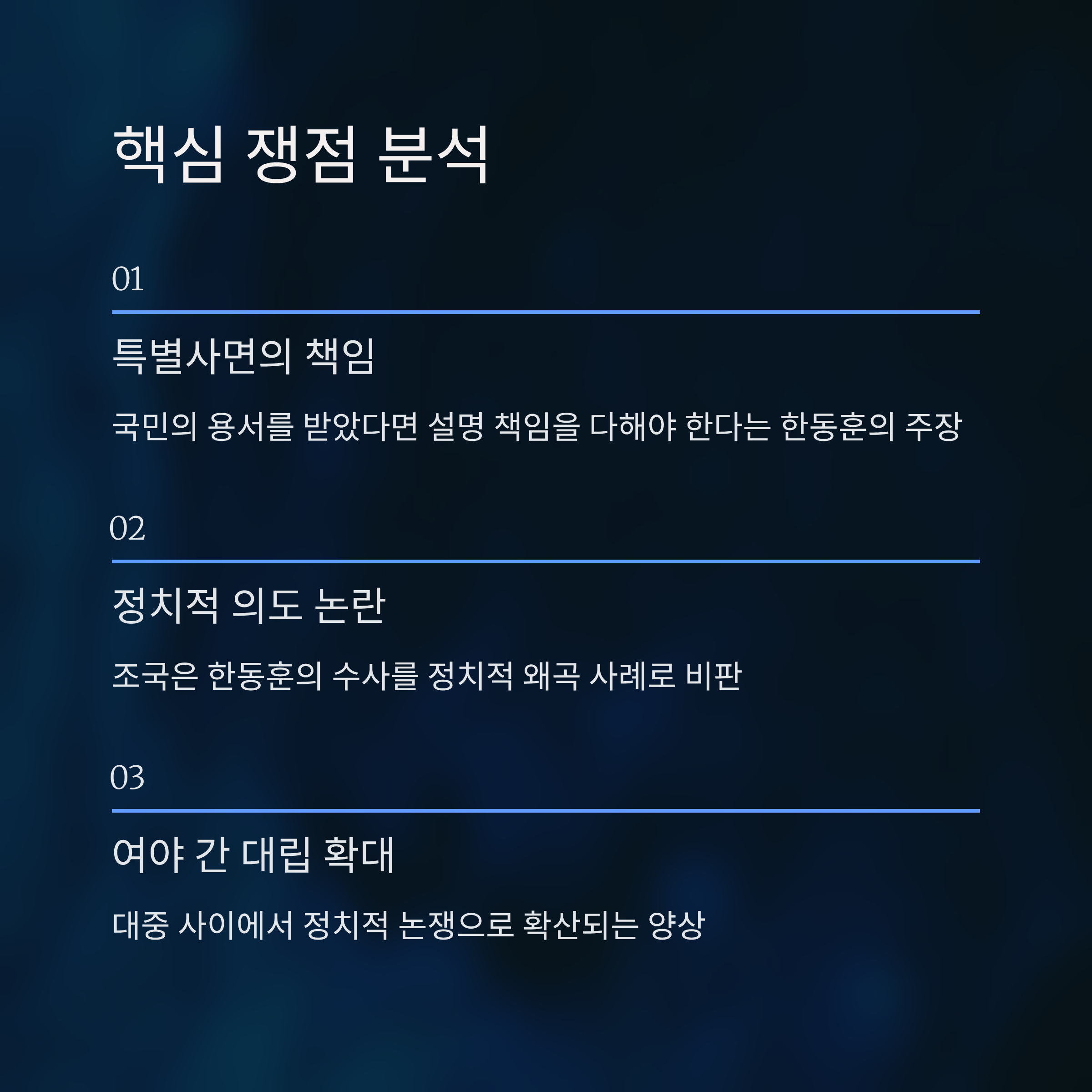 이번 논의는 단순히 한동훈-조국 간의 대립 구도로만 보아서는 안됩니다. 이는 특별사면의 명분, 정치적 책임, 그리고 대장동 사건의 본질적 논의로 이어질 가능성이 농후합니다. 야권의 입장에서는 자신들의 주요 인사가 사면된 뒤 더욱 압박받는 상황으로 비춰질 수 있고, 더 나아가 여당에 의해 정치적 연계성이 의심받는 과정에서 내부 결집력이 흔들릴 가능성도 존재합니다.