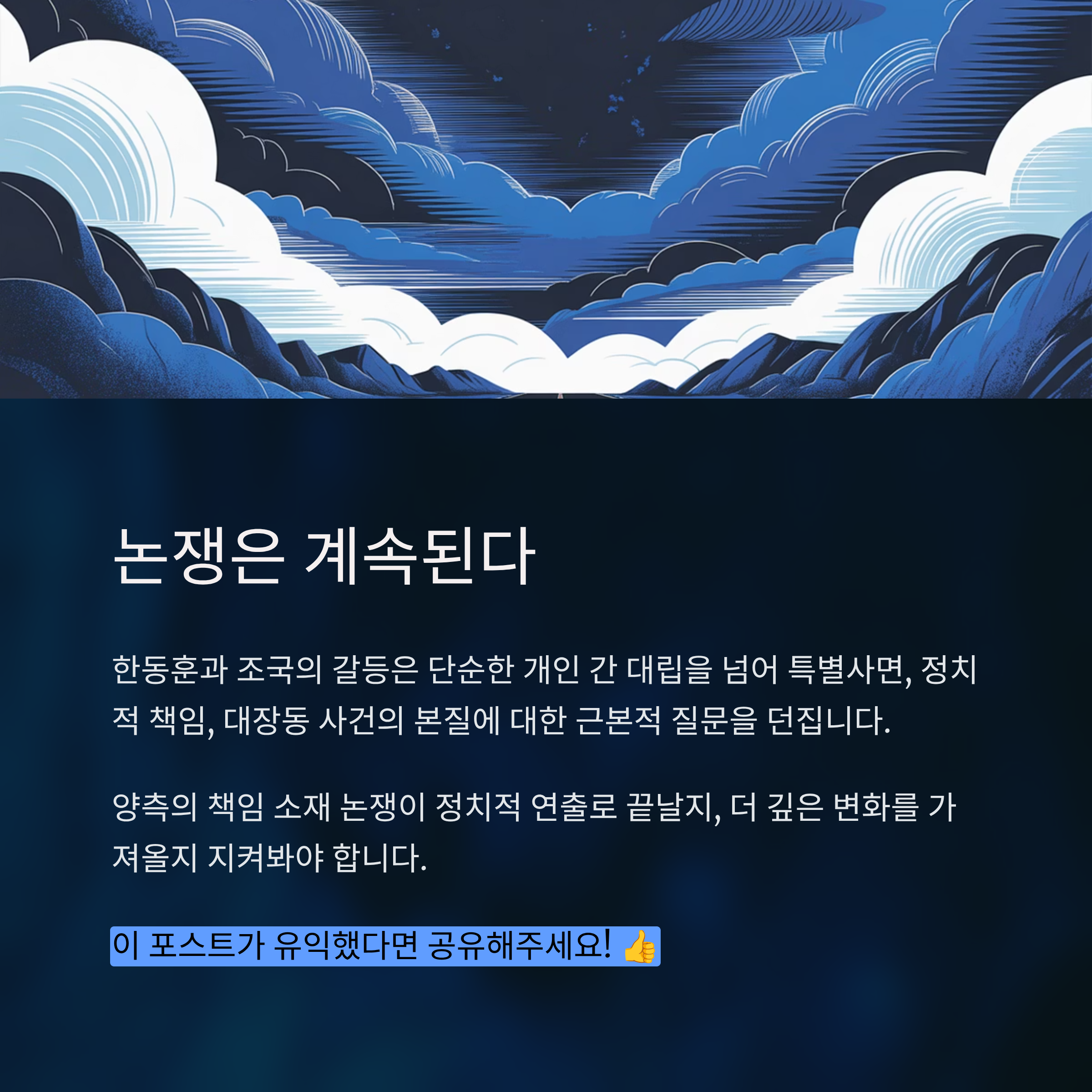 조국 역시 방어적 자세를 넘어서 적극적인 반격으로 대응하면서 여전히 정치적 영향력을 유지하려는 태도를 보이고 있습니다. 이번 충돌은 향후 대장동 사건이 정치적, 법적 국면에서 어떤 결과를 가져오느냐에 따라 더 큰 파장을 일으킬 가능성을 내포하고 있습니다. 결국, 양측의 책임 소재 논쟁이 단순한 정치적 연출로 끝날 것인지, 아니면 더 깊은 변화를 야기할지 지켜보는 것이 중요합니다.