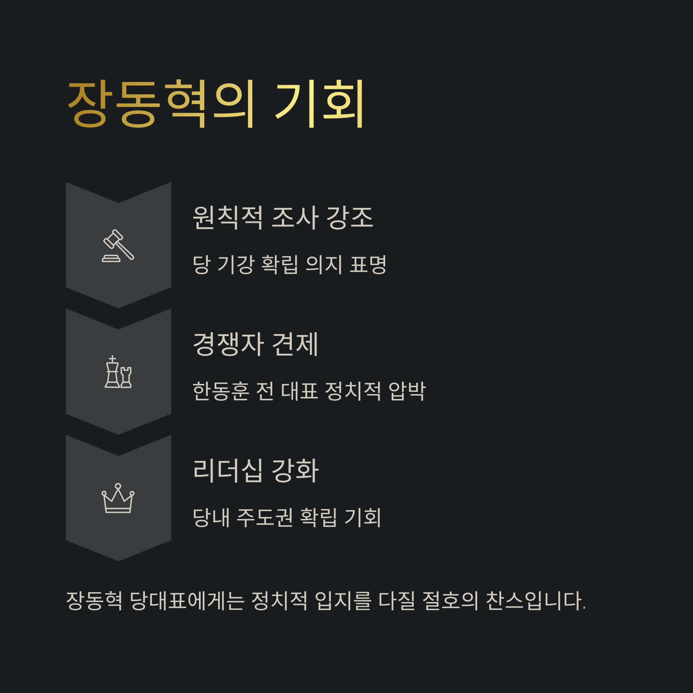 이 사건은 장동혁 당대표에게 당내 주도권을 확립할 절호의 기회이자 동시에 중대한 시험대입니다.