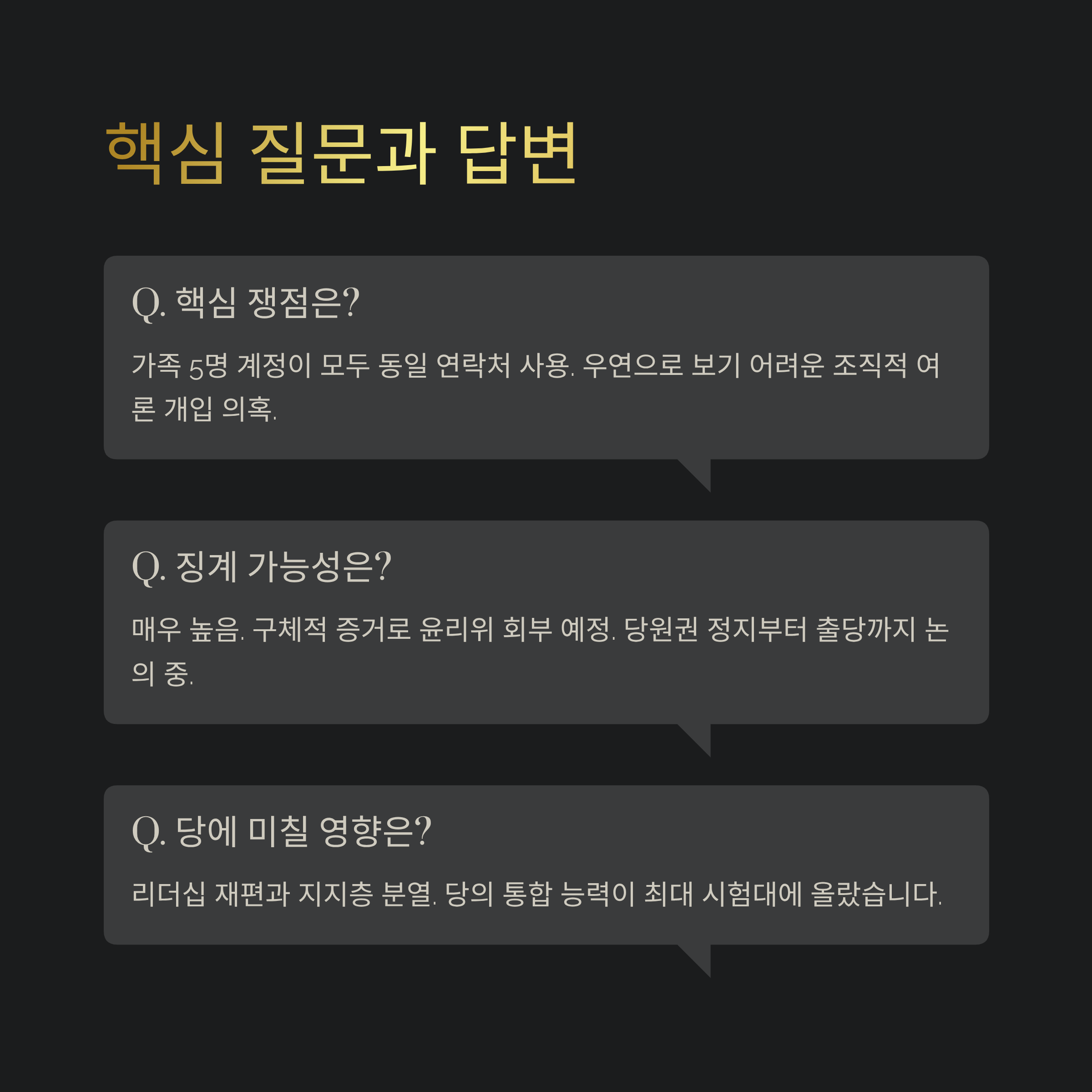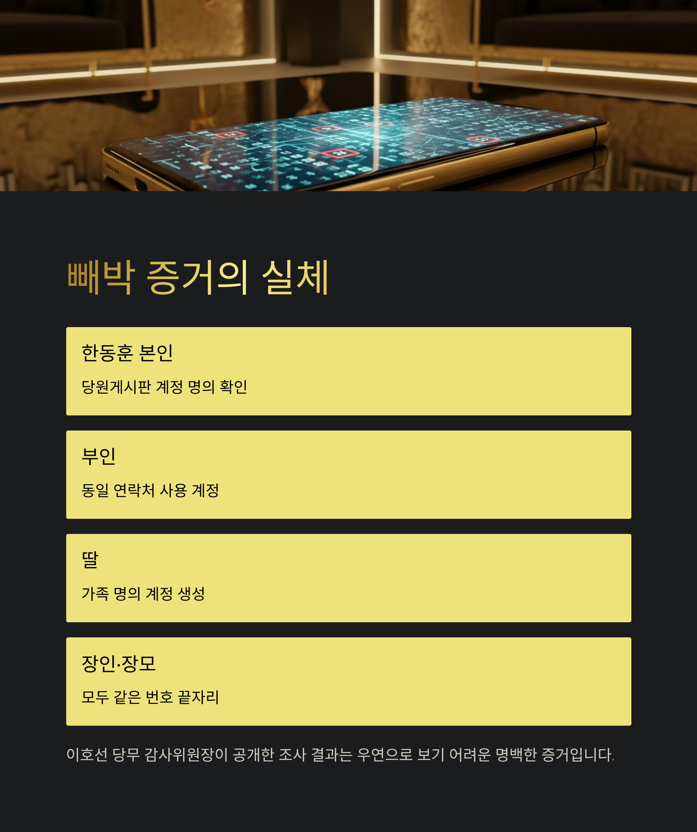 | A. 한동훈 전 대표와 그의 직계가족 4명의 명의로 만들어진 당원게시판 계정들이 모두 동일한 연락처 뒷번호를 사용했다는 점입니다. 이는 우연으로 보기 어려운 정황으로, 조직적인 여론 개입 시도 의혹을 낳고 있습니다. |