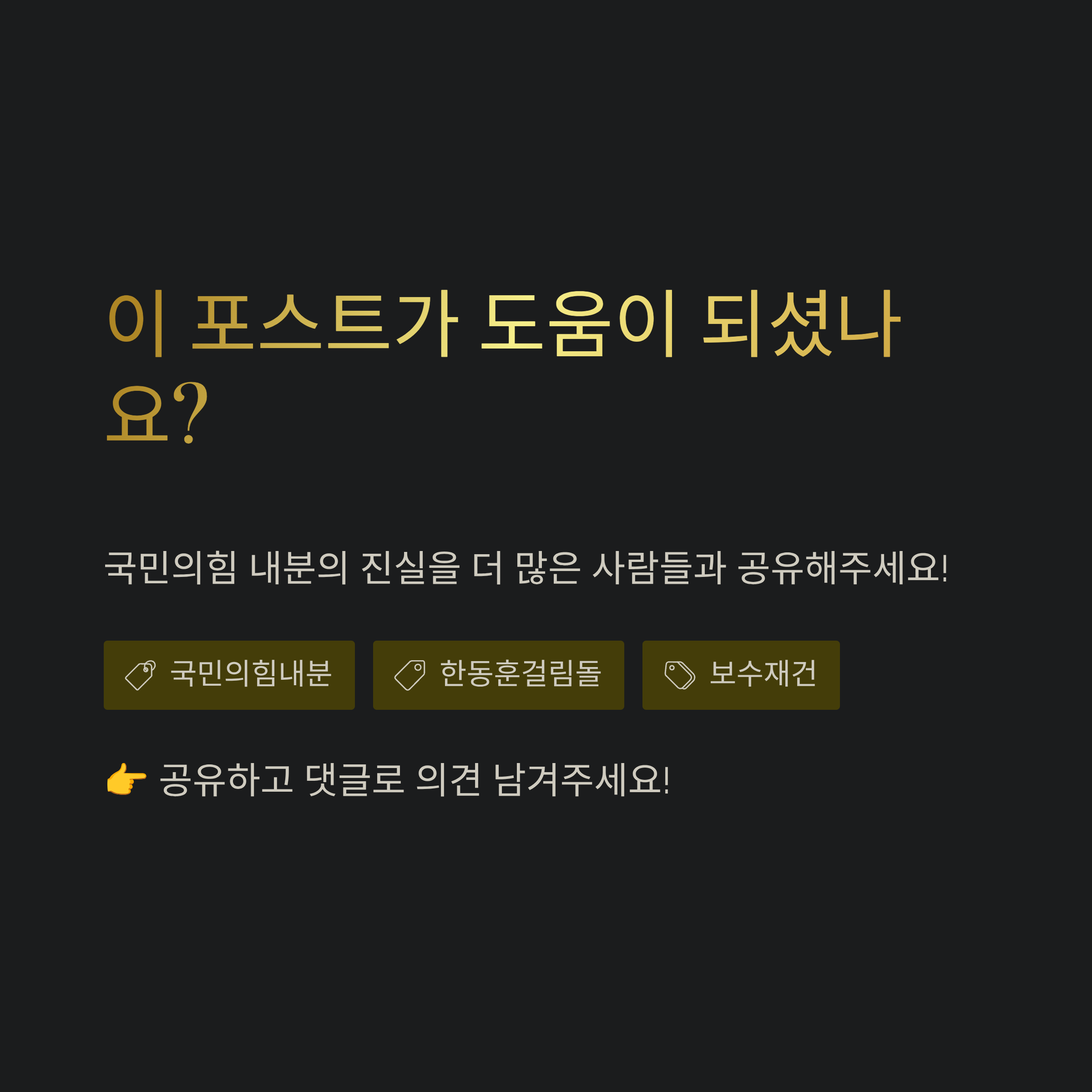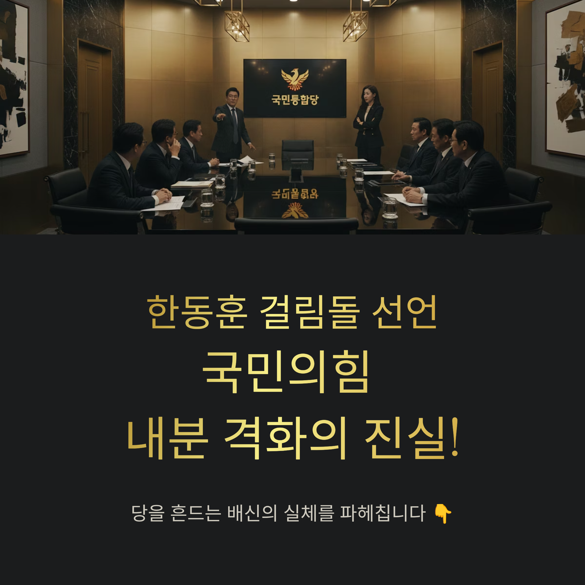 이재명 정권 출범과 비상계엄 사태 이후, 대한민국은 그야말로 풍전등화의 위기에 놓여 있습니다. 국가적 위기 상황 속에서 보수 진영의 중심축인 국민의힘은 장동혁 대표 체제하에 당의 통합과 쇄신을 위한 어려운 길을 걷고 있습니다. 당을 재건하고 정통 보수의 가치를 바로 세우기 위한 노력이 절실한 이 시점에, 오히려 내부에서 총질하며 당을 분열시키는 세력이 등장했습니다. 바로 한동훈 전 위원장과 그를 추종하는 세력입니다. 이들은 당의 재건 노력에 찬물을 끼얹으며 스스로를 '걸림돌'이라 칭하는 기이한 행태를 보이고 있습니다. 본문에서는 이들이 왜 당의 화합을 저해하는 걸림돌을 자처하며 당을 흔들고 있는지, 그들의 진짜 속내는 무엇이며 국민의힘 내분 격화의 진실은 어디에 있는지 심층적으로 파헤쳐 보겠습니다.