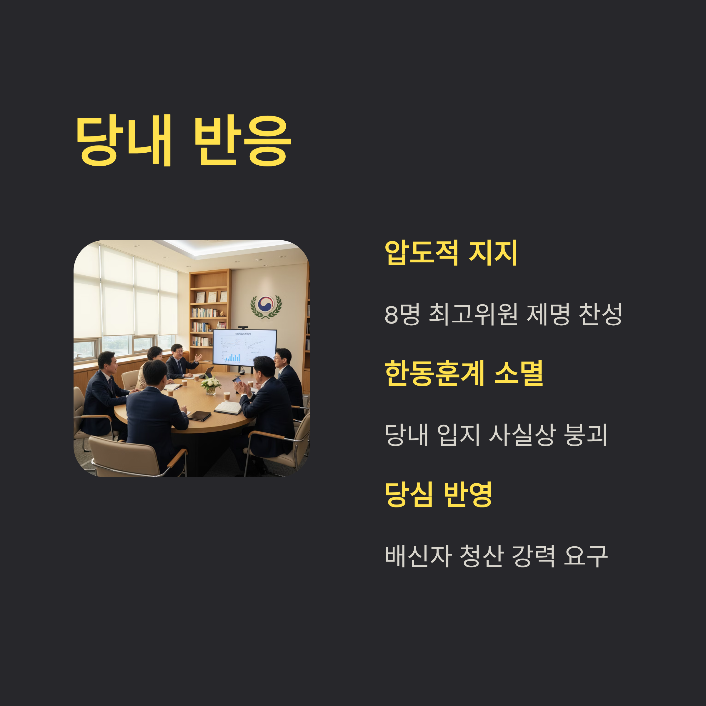 먼저, 최고위원 9인 중 8인이 찬성한 8대 1의 압도적 표결로 가결되어 당 지도부의 단호한 입장을 보여주었습니다.