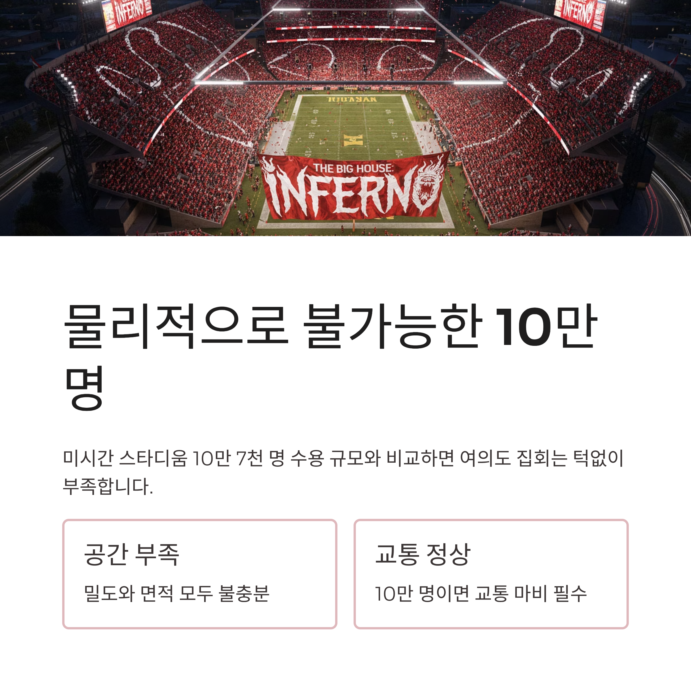 | A. 아닙니다. 주최 측은 10만 명을 주장했으나, 경찰 추산 인원은 약 6천 명 내외에 불과했습니다. 방송에서는 미시간 스타디움 등 실제 10만 명이 모인 사진과 비교하며, 여의도 집회 공간과 밀도로는 10만 명 수용이 물리적으로 불가능함을 시각적으로 증명했습니다. 이는 언론과 주최 측의 과장된 선동일 뿐입니다. |