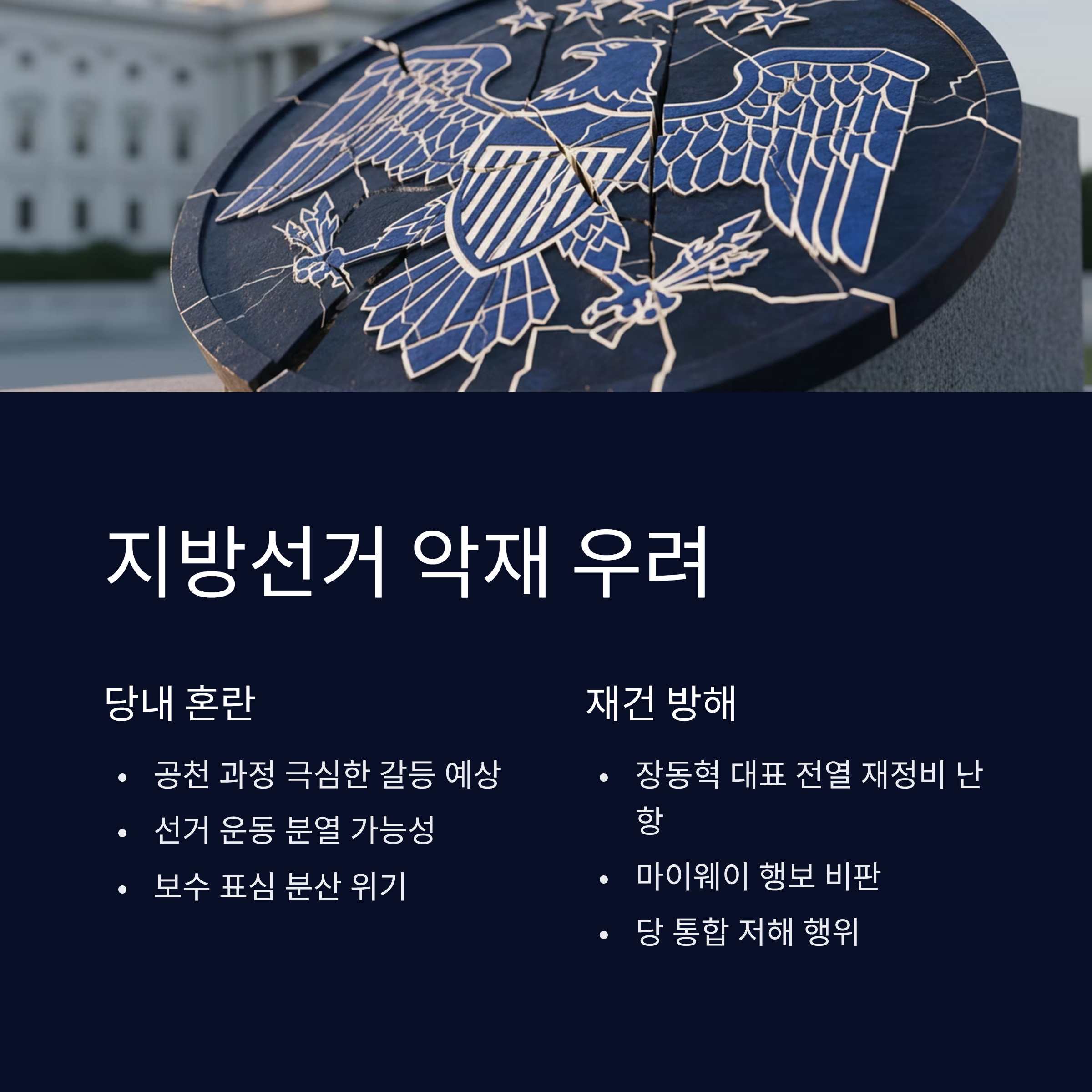 국민의힘 내분 격화: 장동혁 대표 체제의 당내 결속 노력과 한동훈의 장외 무력시위가 충돌하며, 다가오는 지방선거를 앞두고 당내 분열이 가속화될 전망입니다.