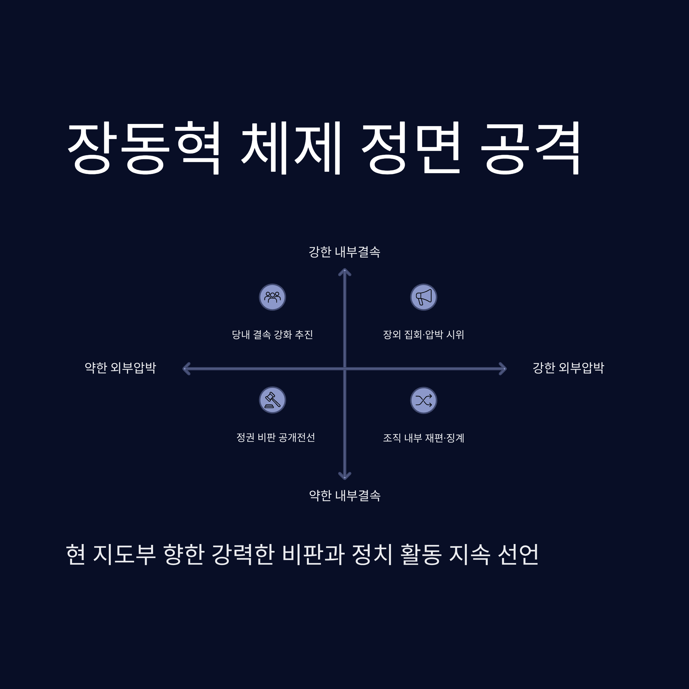 지도부 정면 공격: 현 장동혁 대표를 겨냥해 윤석열 전 대통령 시절 시작된 '김옥균 프로젝트(한동훈 축출 시도)'를 마무리한 인물이라 비난하며 정치 활동 지속을 선언했습니다.