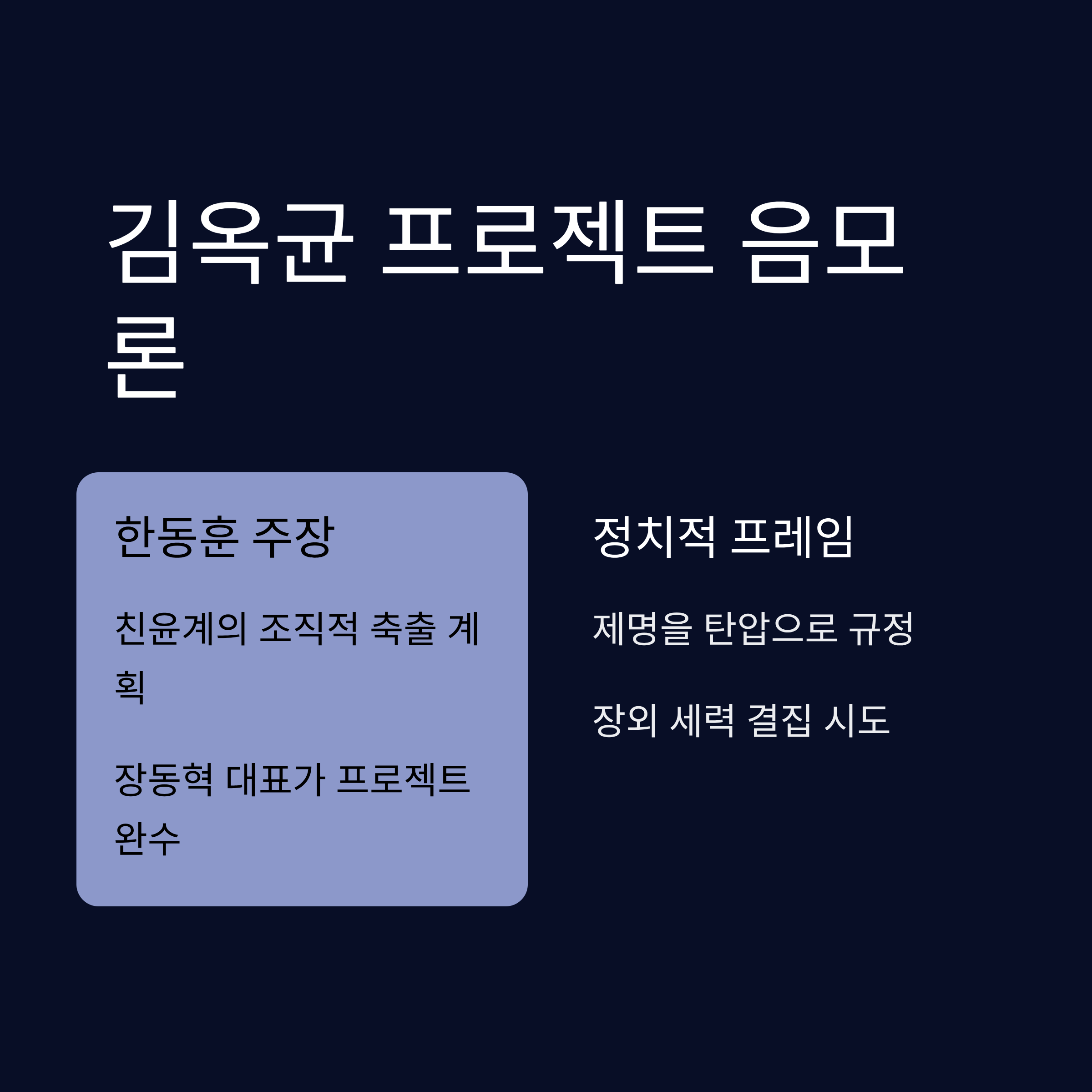 | A2. 2024년 당시 친윤계가 당 대표였던 한동훈을 축출하려고 계획했다는 의혹을 한동훈 측에서 지칭하는 용어입니다. 한동훈은 이번 제명이 과거 실패했던 이 프로젝트를 장동혁 현 대표가 이어받아 마무리한 정치적 공작이라고 주장하고 있습니다. |
