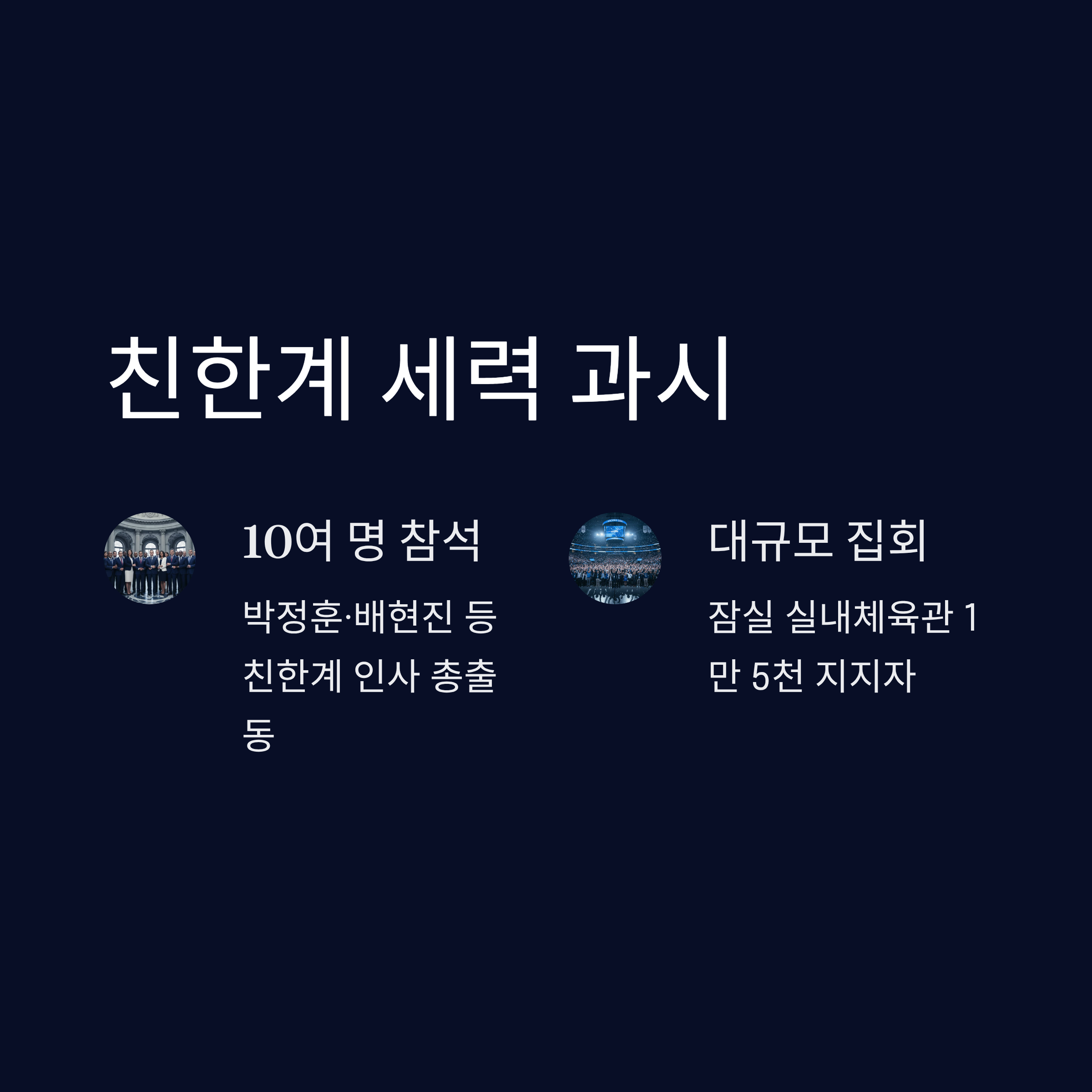 세력 과시 및 논란: 박정훈, 배현진 등 친한계 인사 10여 명이 참석해 건재함을 과시했으나, R석 8만 원 등 고액 티켓 판매로 '정치 팬덤 장사' 비판에 직면했습니다.