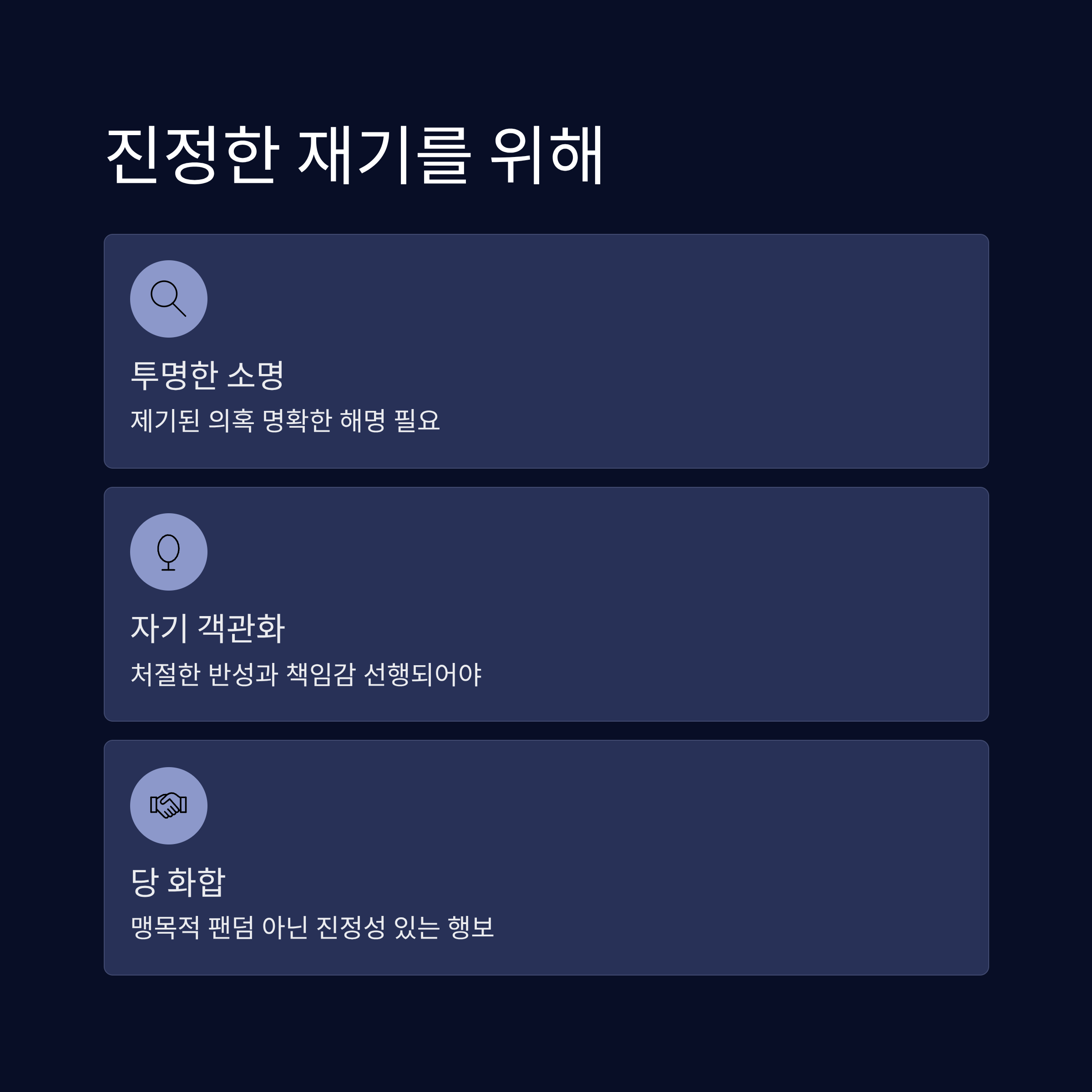 혐의 전면 부인: 한동훈 전 대표는 당무감사위와 윤리위가 "쓰지도 않은 글을 썼다고 조작해 제명했다"며 억울함을 호소하고, 가족의 여론 조작 의혹에 대해 "몰랐으며, 알았다면 말렸을 것"이라고 책임을 회피했습니다.