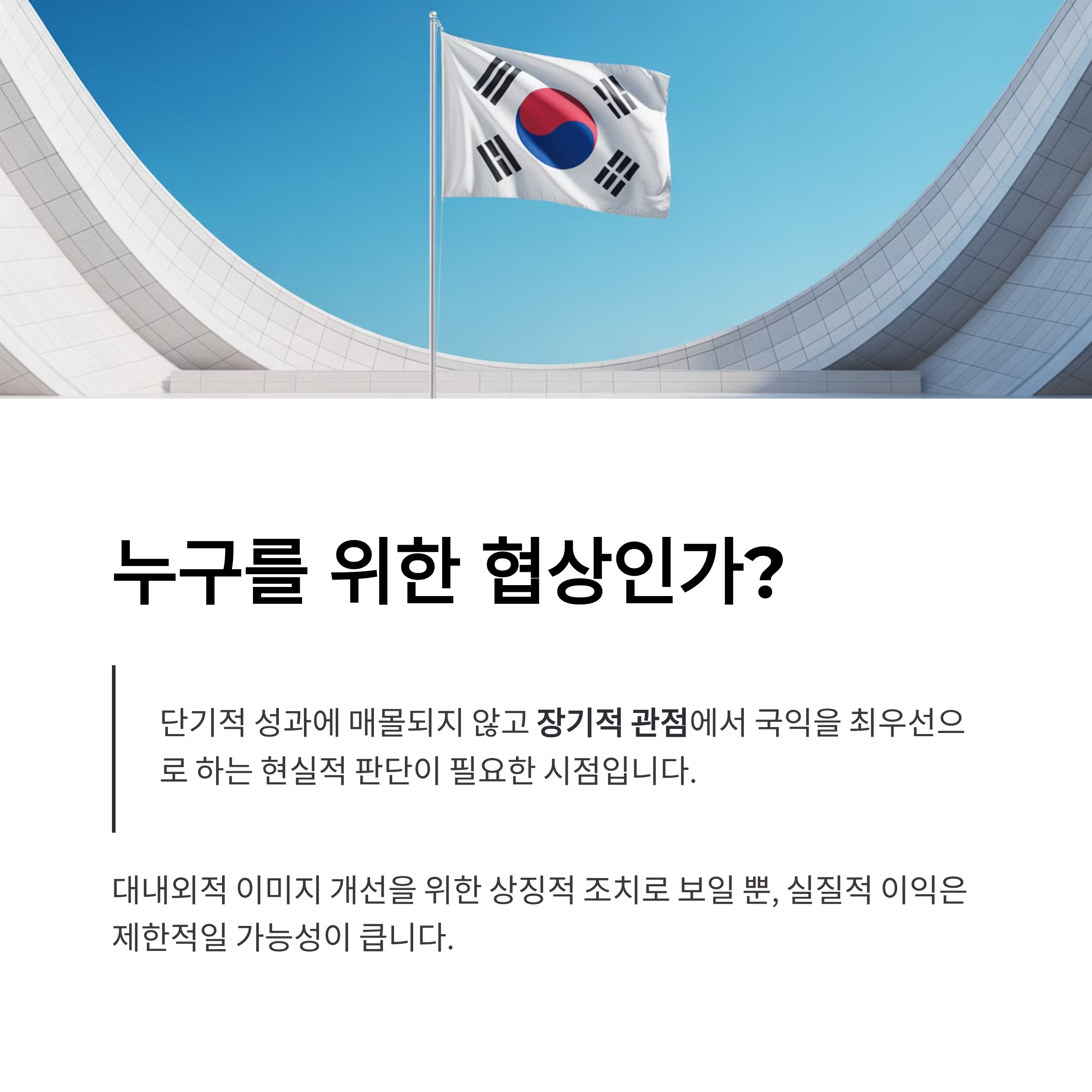 이번 정상회담의 주요 합의점들은 단기적으로는 매우 긍정적인 결과처럼 보이지만, 장기적 관점에서 그 실효성은 여전히 검증되지 않은 상태입니다. FTA 관세 재도입, 핵추진 잠수함 관련 약속의 미비점, 투자 상한선으로 인한 경제 정책 제한 등은 모두 재검토가 필요한 사항들입니다. 결국 이 협상은 대내외적 이미지를 개선하기 위한 상징적 조치로 보일 뿐, 한국경제가 실질적으로 얻는 이익은 제한될 가능성이 큽니다. 단기적 성과에 매몰되지 않고 장기적 관점에서 국익을 최우선으로 하는 현실적 판단이 요구되는 시점입니다.