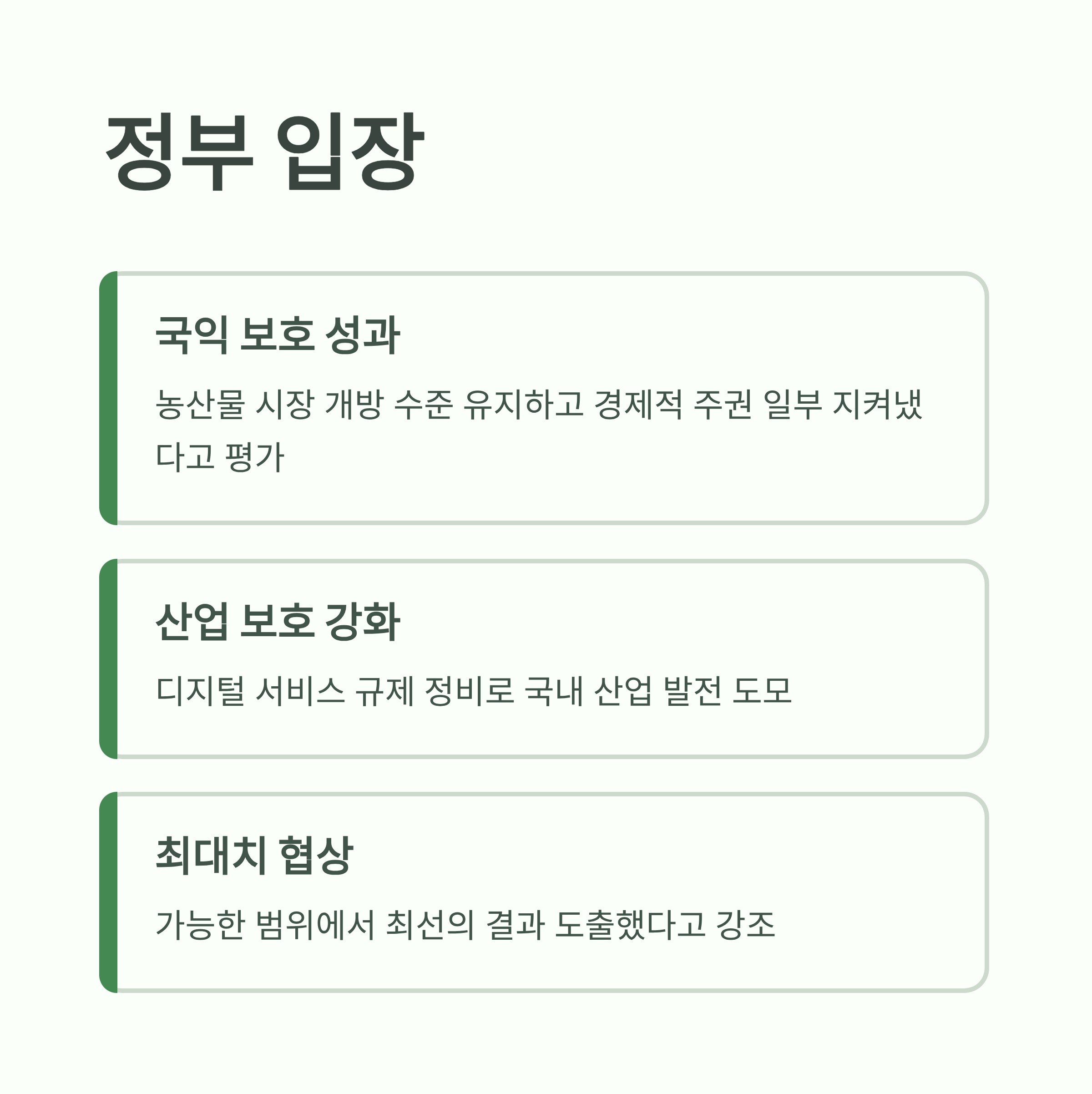 정부는 이번 한미 관세 협상이 농산물 시장 개방을 방지하고 경제적 주권을 일부 지켜낸 성과로 평가합니다.