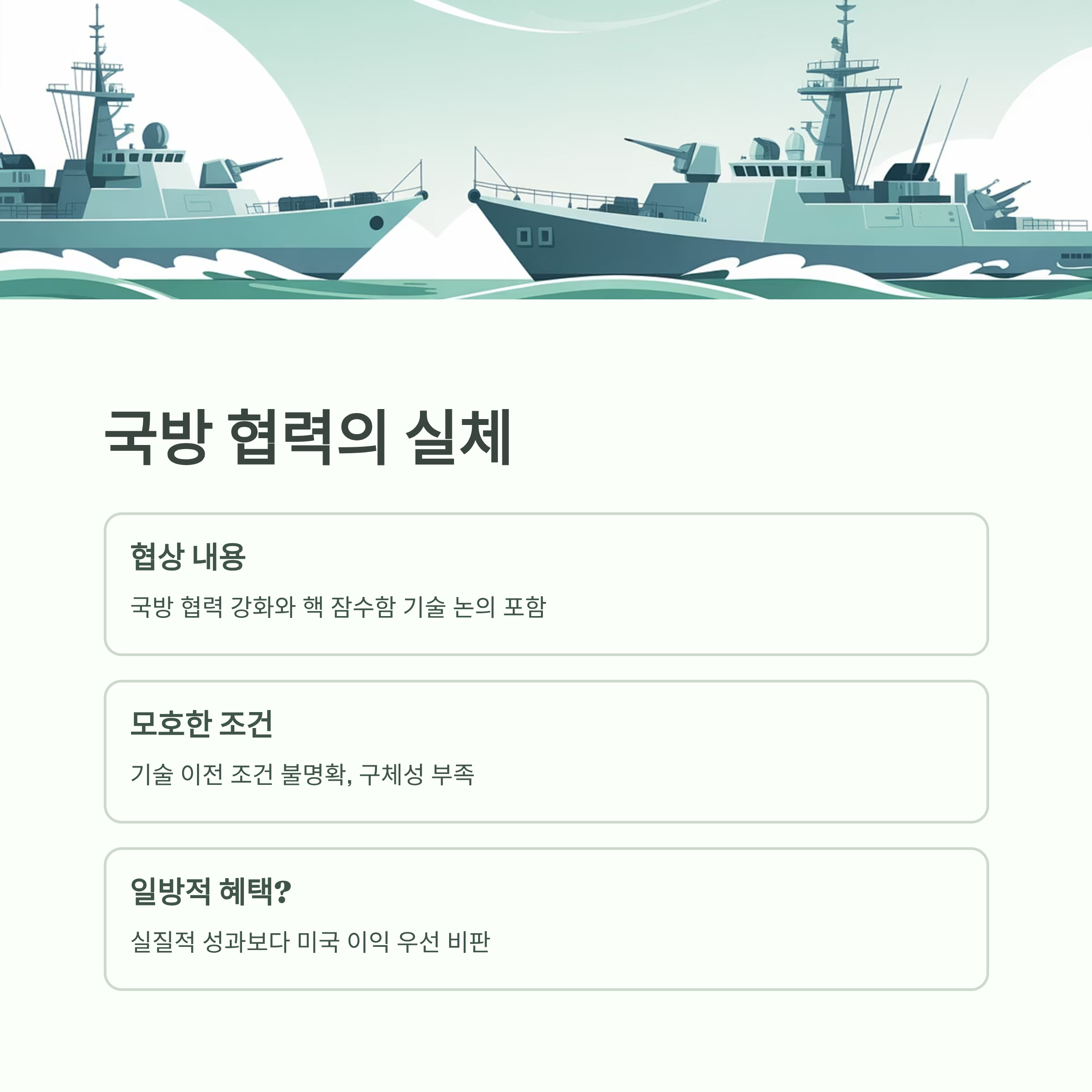 협상 내용 중 국방 협력 강화와 핵 잠수함 기술 관련 논의가 포함되었지만, 이에 대한 구체적인 내용은 모호합니다. 미국 측 일부 발표에서 기술 이전의 조건이 명확히 제시되지 않아 실질적인 성과에 대한 의문이 남습니다. 이는 국방 안보 협력의 강화라는 명분을 내세웠지만, 실제로는 일방적인 혜택이 미국에 돌아간 것이 아니냐는 비판으로 이어지고 있습니다.