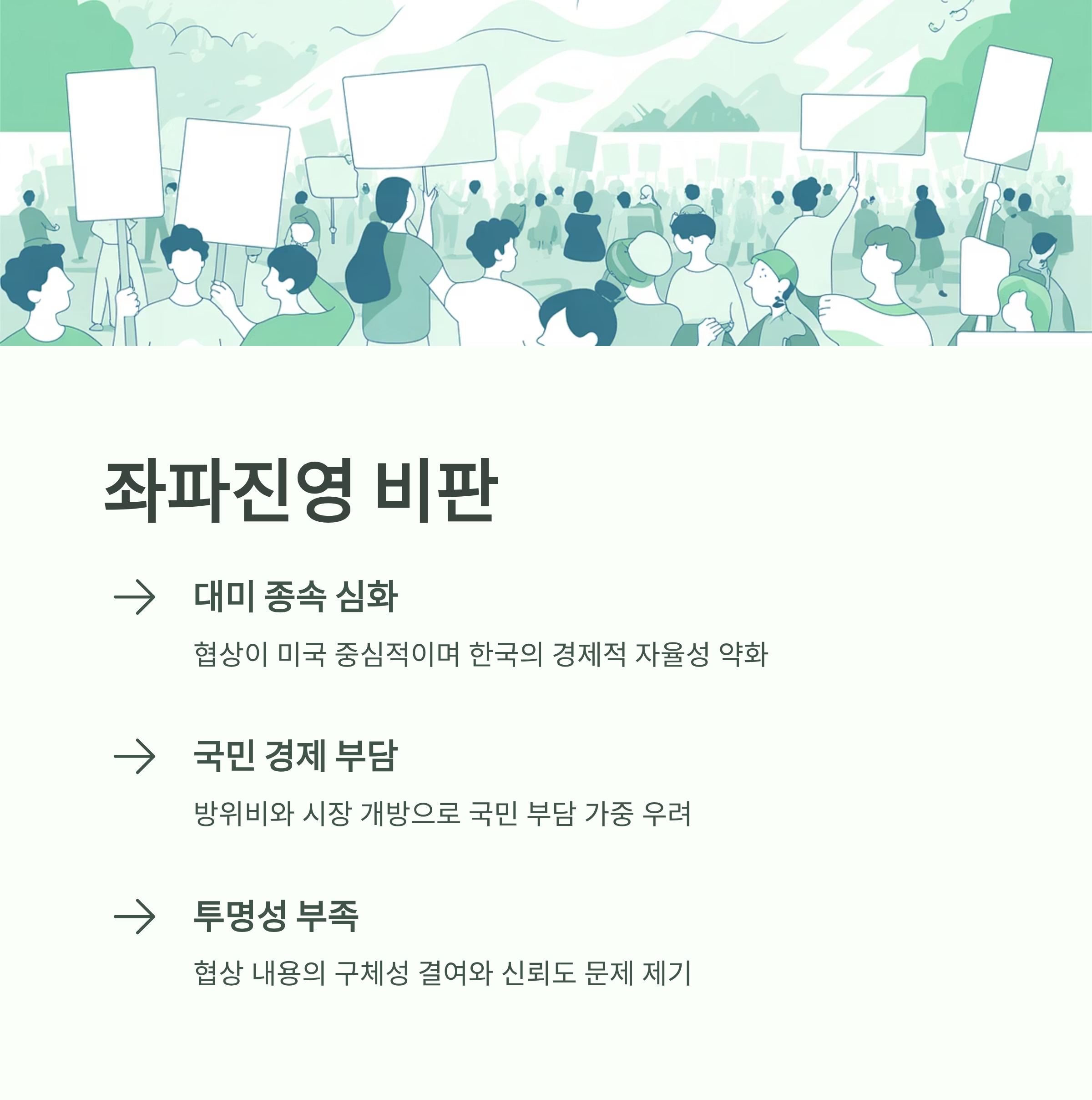 좌파진영은 해당 협상이 대미 종속적이며, 국민 경제에 부정적 영향을 미칠 수 있다고 우려합니다.