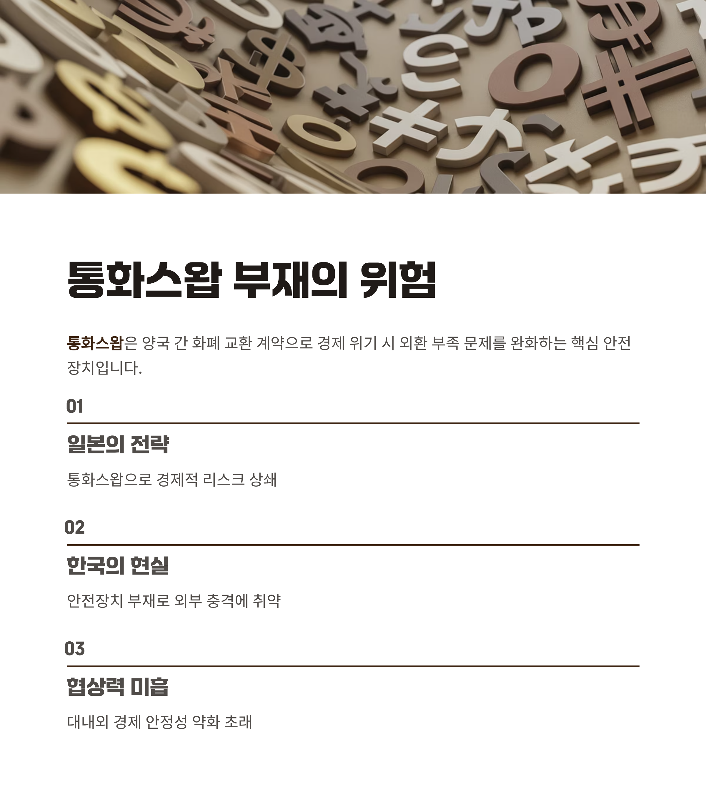 | A. 통화스왑은 외환 부족 시 경제 위기를 완화하기 위한 중요한 안전장치입니다. 이번 협상에서 일본은 이를 포함해 경제적 리스크를 관리할 수 있었지만, 한국은 해당 장치가 부재한 상태로 더욱 취약한 상황에 놓였습니다. |