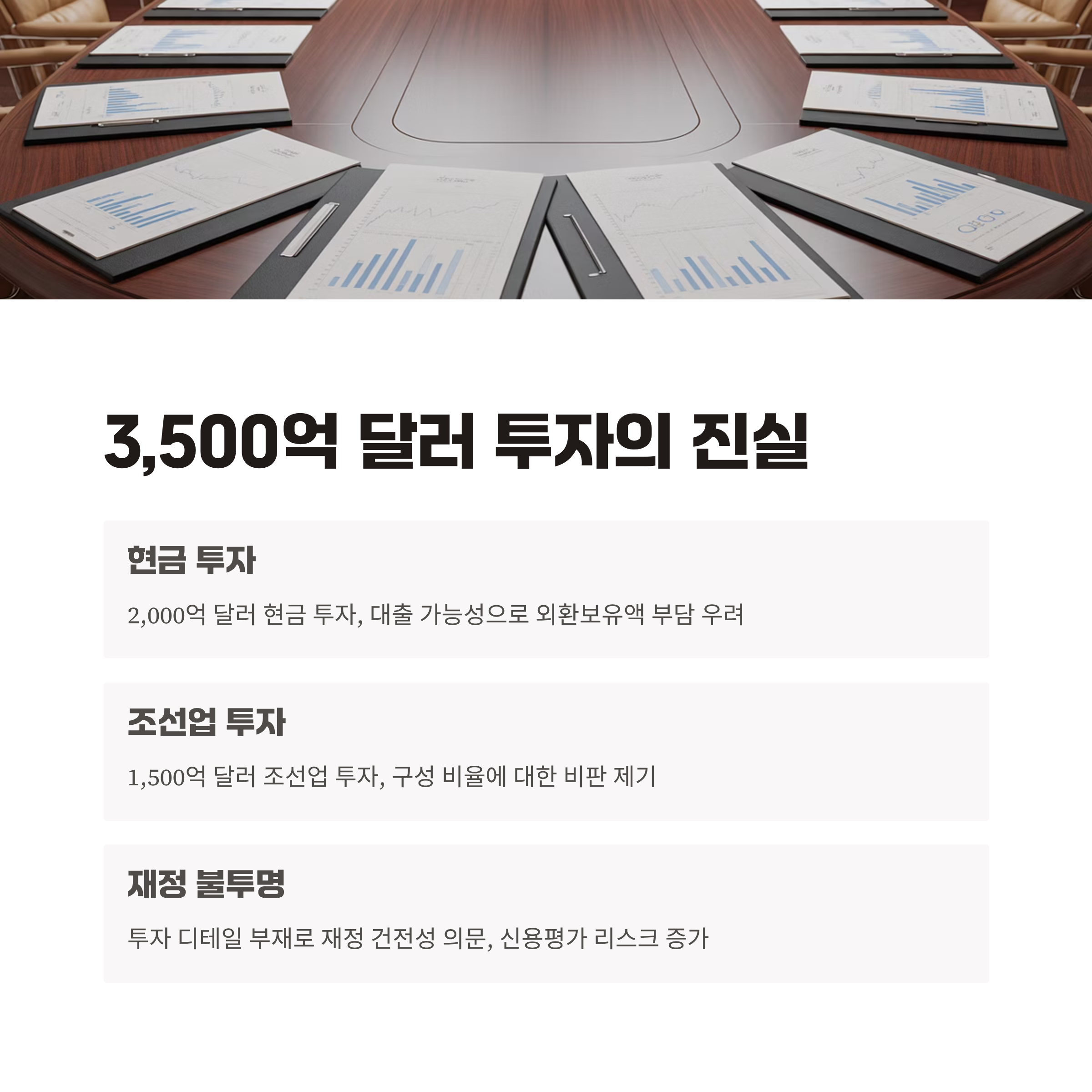 이번 한미 관세 협상은 총 3,500억 달러의 대미 투자를 약속한 것으로 발표됐다. 그러나 투자 금액 구성에 있어 2,000억 달러는 현금으로, 1,500억 달러는 조선업 투자라는 점이 부합되지 않는다는 비판을 받고 있다. 특히 현금 확보를 위한 대출 가능성이 언급되며 외환보유액의 부담이라는 우려가 있다. 추가로, 투자액 대비 정부 및 민간의 실질적 재정 상황이 명확히 공개되지 않아 재정 건전성에 대한 의문이 생긴다. 이는 경제적 불확실성을 증폭시키며 해외 신용 평가사들에게 부정적 신호가 될 수 있다.