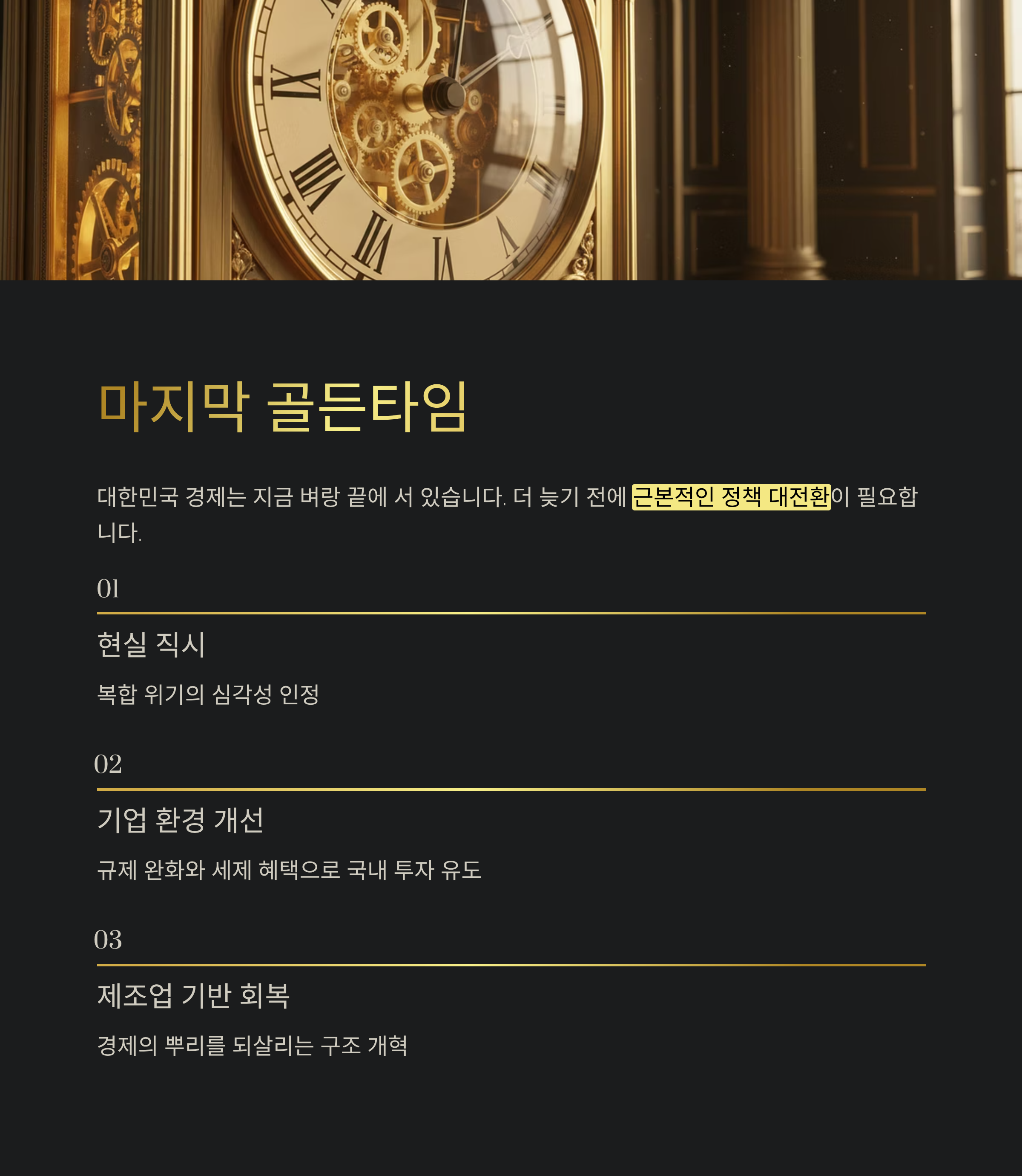 지금은 마지막 골든타임입니다. 더 이상 미룰 수 없습니다. 정부는 소비 쿠폰 살포와 같은 임시방편이 아닌, 근본적인 정책 대전환에 나서야 할 시점입니다.