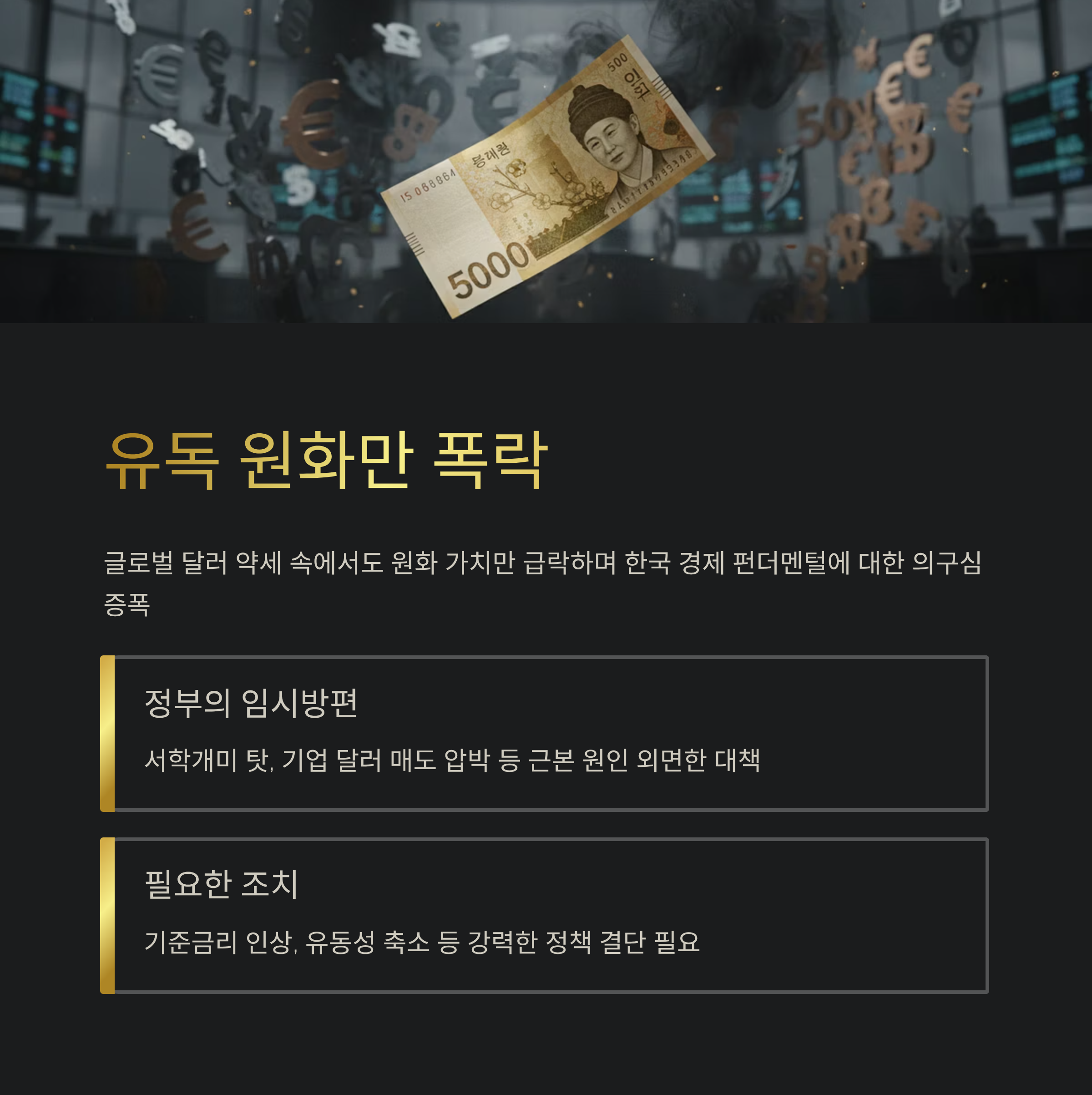 대한민국 경제가 외환위기 이후 최고 수준의 고환율 위기에 직면하며 비상등이 켜졌습니다.
