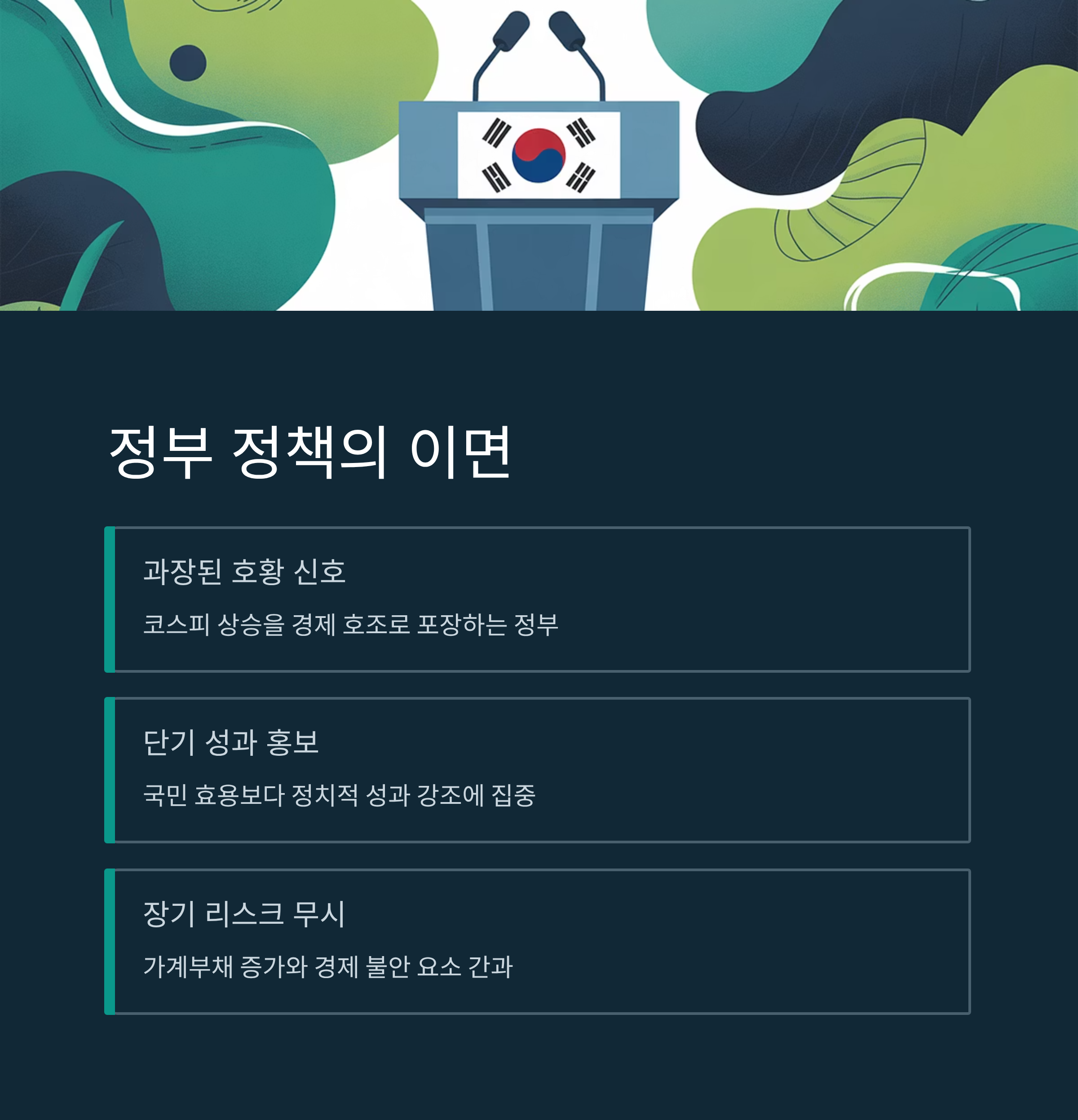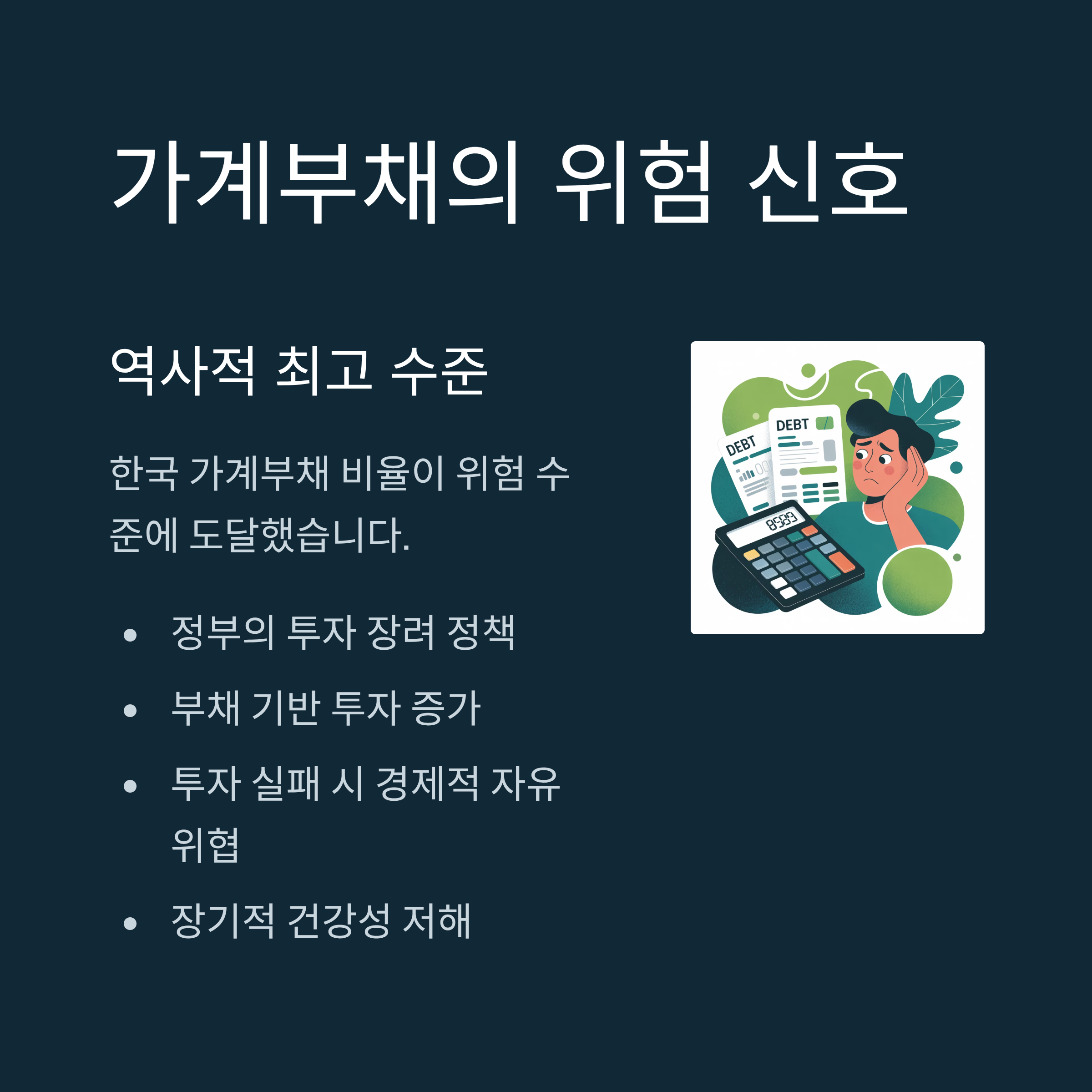 정부는 코스피 상승을 경제 호조의 신호로 과장하며 가계부채를 통한 투자 장려에 나섰습니다. 하지만 이는 국민 경제의 장기적인 건강성을 저해할 수 있다는 지적이 많습니다. 특히 가계부채 비율이 역사적으로 높은 상황에서 투자 실패는 국민 개개인의 경제적 자유를 위협하며 부채 축적으로 이어질 가능성이 큽니다. 국민은 이 같은 상황을 인식하고, 시장 흐름을 면밀히 분석하며 섣부른 투자보다는 재정 건전성을 우선시해야 합니다.