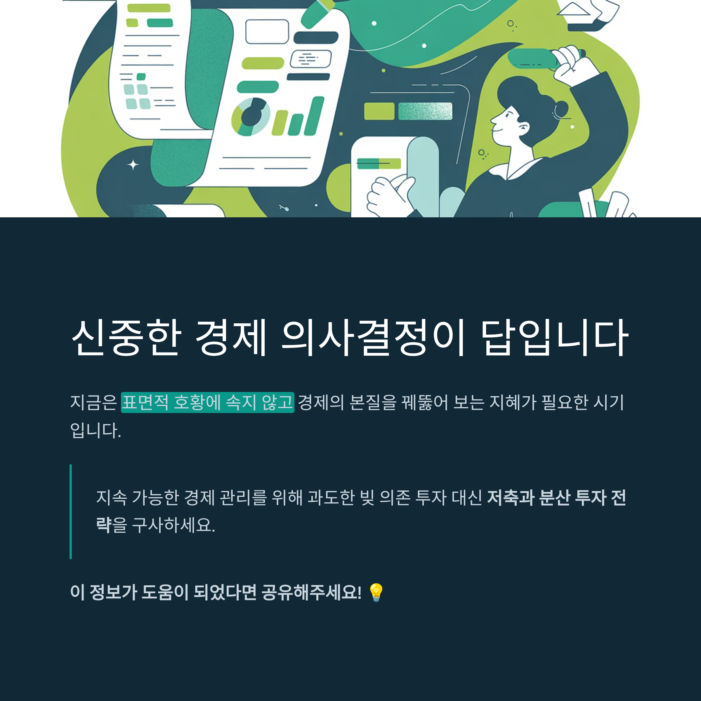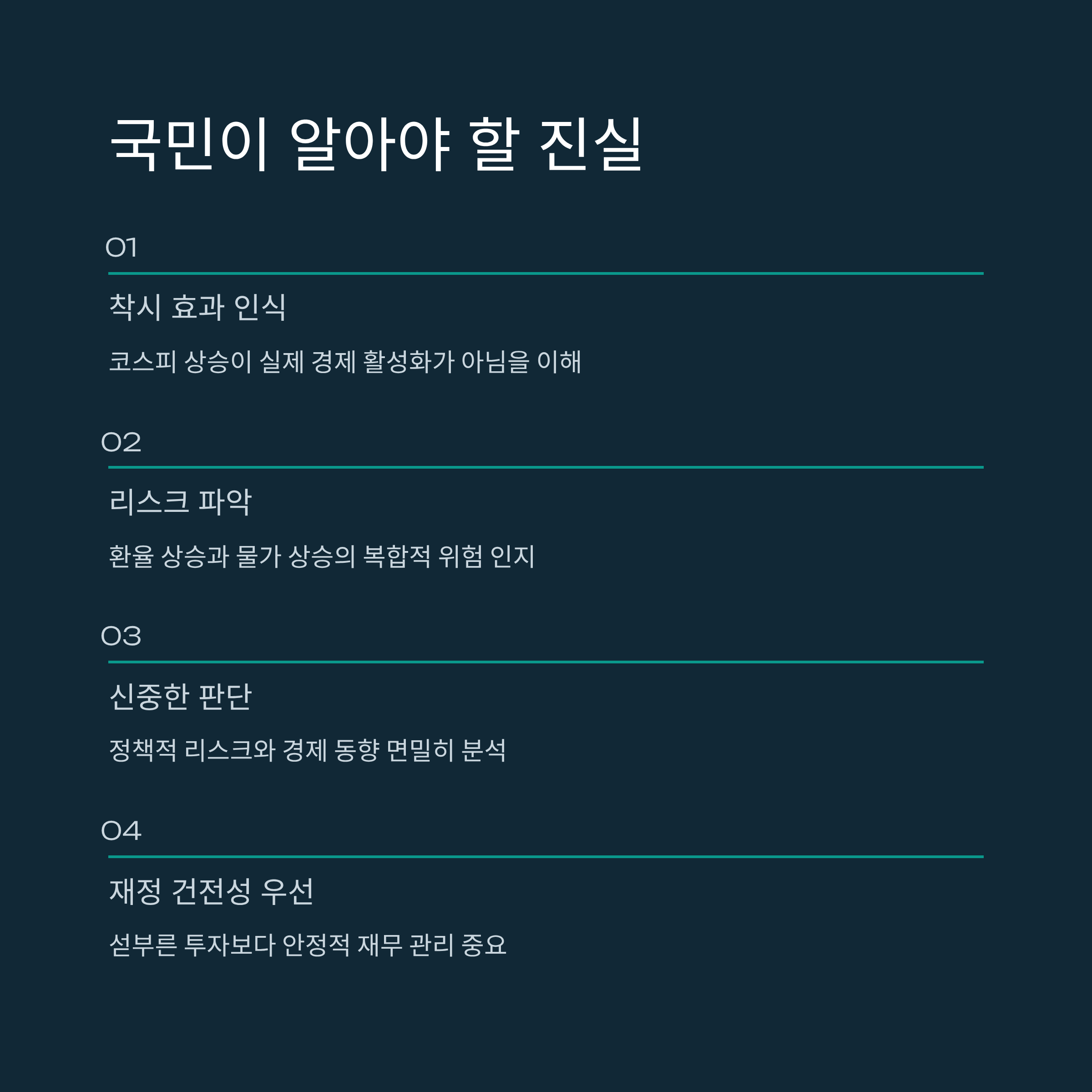 지금 한국의 주식시장과 환율 변동 상황은 단순히 경제 호황으로 해석될 수 없습니다. 코스피 상승은 외국인 투자 유입이라는 외적인 요인에 기인하며, 내부적으로는 환율 상승과 물가 상승이라는 리스크를 품고 있습니다. 정부는 이를 호황으로 치장하고 있지만, 국민들은 이면의 위험을 자각하고 신중한 경제적 의사 결정을 해야 합니다. 지속 가능한 경제 관리를 위해 지나친 빚 의존 투자 대신 저축과 분산 투자 전략을 구사하는 것이 바람직합니다.