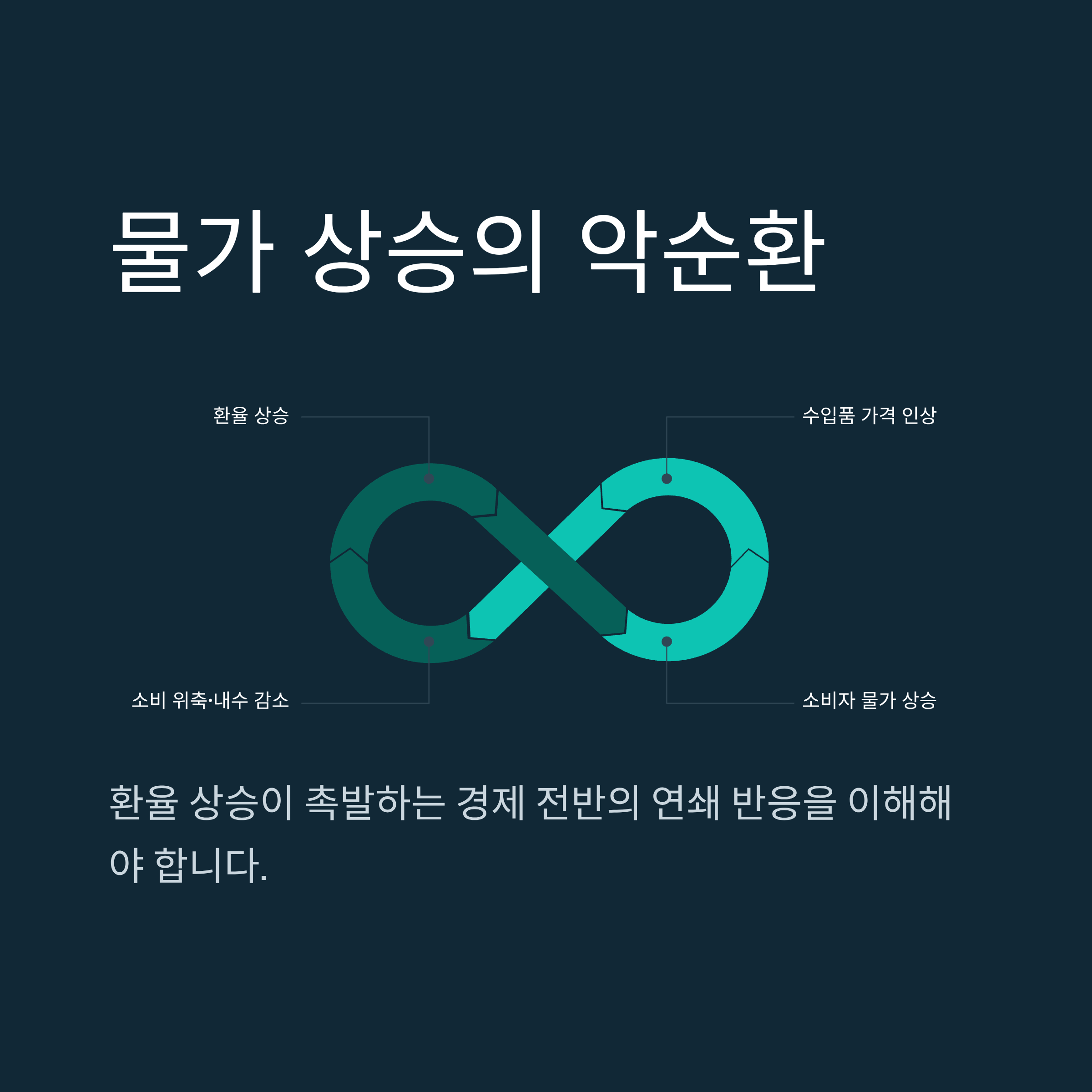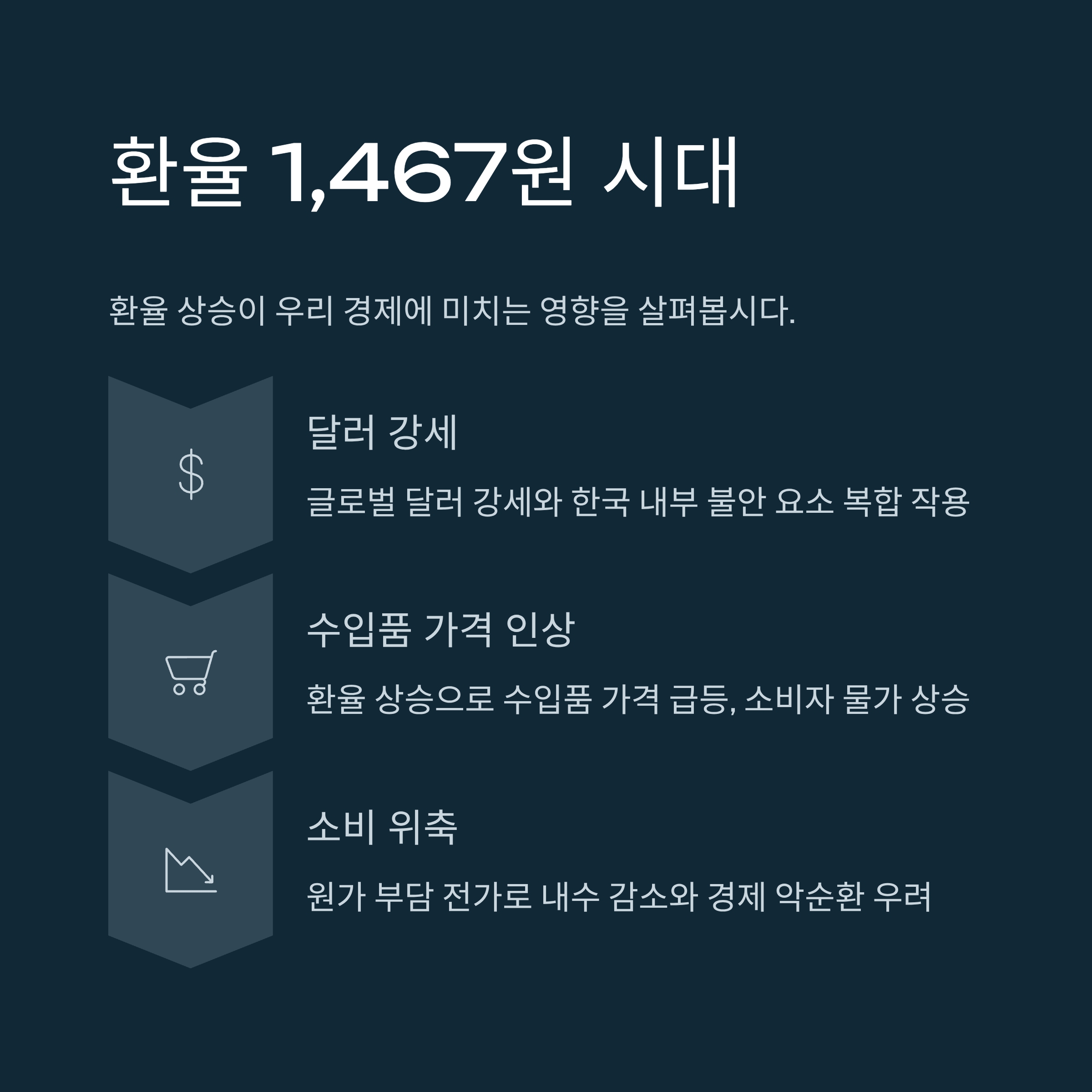 환율 상승은 한국 수입품의 가격을 인상시키며, 이는 곧 소비자 물가 상승으로 이어집니다. 환율이 약 1,467원에 도달한 최근의 흐름은 단순히 한국 경제가 세계 경제 대비 경쟁력을 상실한 것이 아니라, 글로벌 달러 강세와 한국 내부의 경제 불안 요소들이 복합적으로 작용한 결과입니다. 이런 상황에서 기업들은 원가 상승 부담을 소비자에게 전가할 수밖에 없고, 이는 소비 위축과 내수 감소로 이어질 가능성이 큽니다. 특히 가계 부채가 많은 한국 경제에서는 이러한 구조가 경제적 악순환을 초래할 우려가 큽니다.