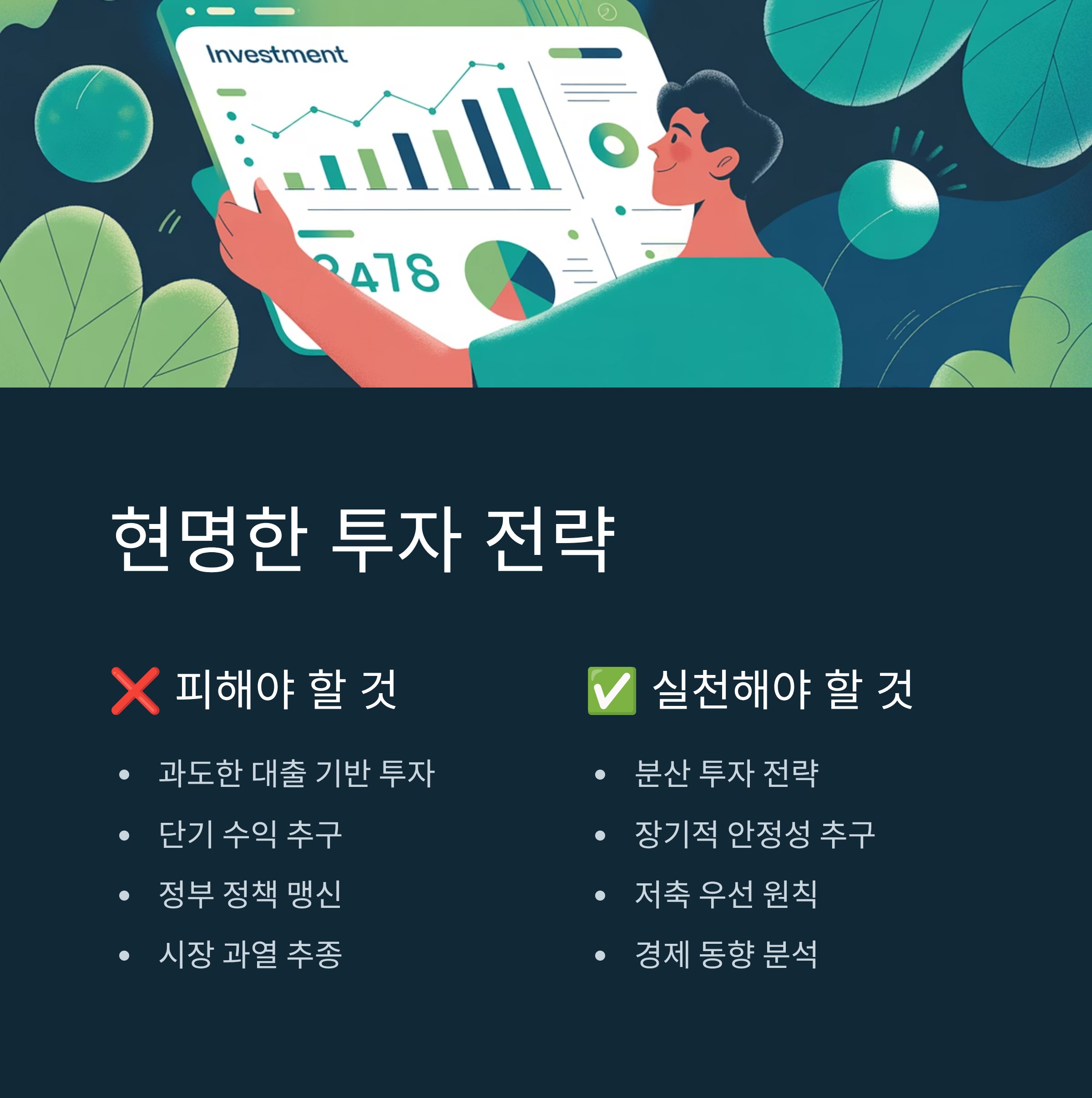 | A. 경제 상황에 대한 충분한 이해를 바탕으로 투자 결정을 내리는 것이 중요합니다. 단기적 수익보다 장기적 안정성에 초점을 맞추고, 과대한 대출을 통제하는 것이 필요합니다. |